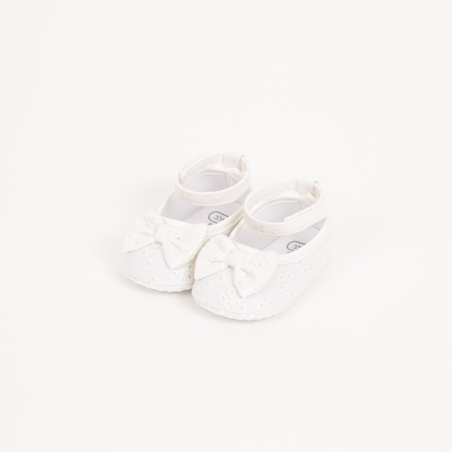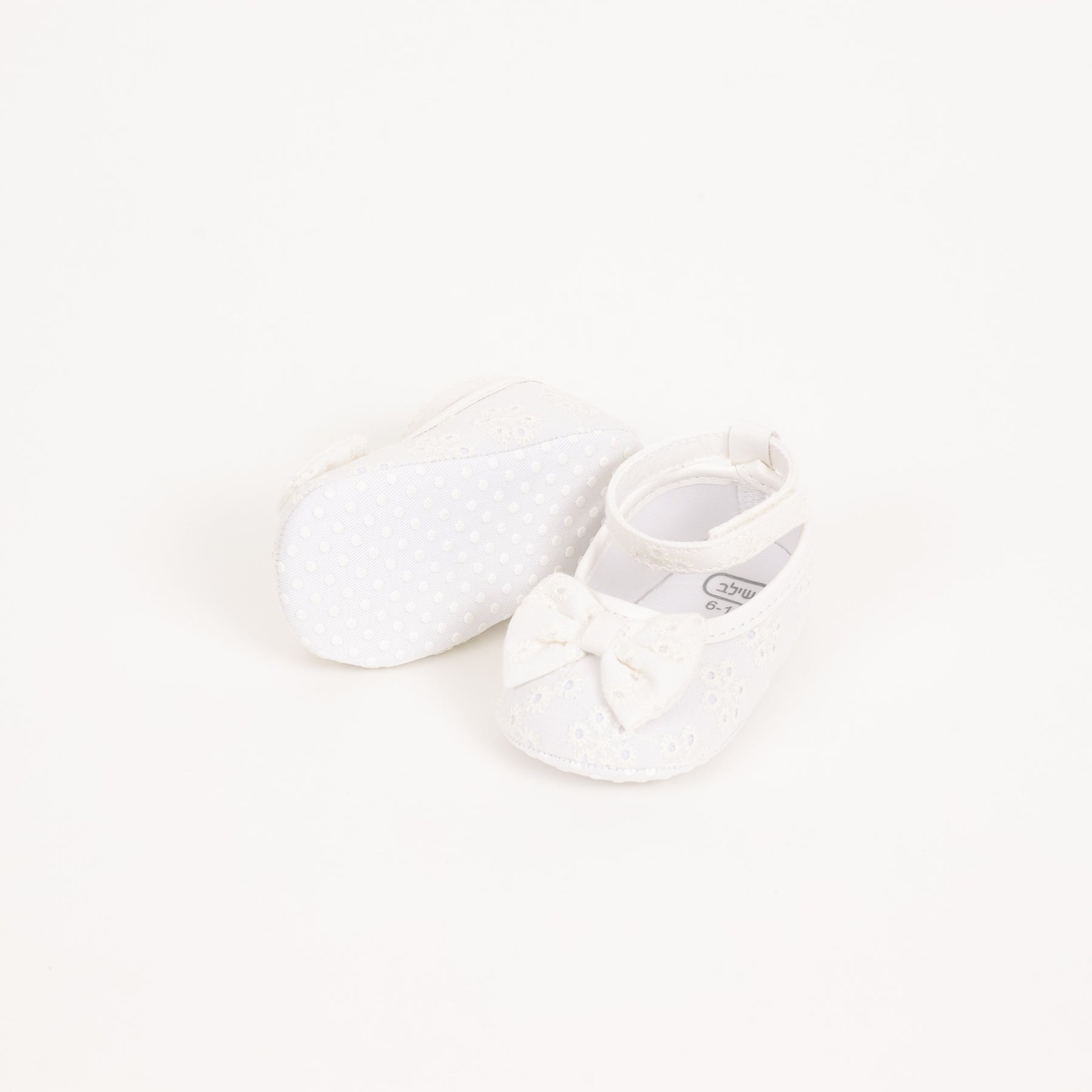 נעלי בובה מתוקות מבד תחרה לבנות עם פפיון מרכזי להשלמת המראה הבובתי. נעליים רכות לתינוקות עם סגירת סקוטץ' בקרסול המשדרגות כל לוק. עשויות פוליאוריטאן.