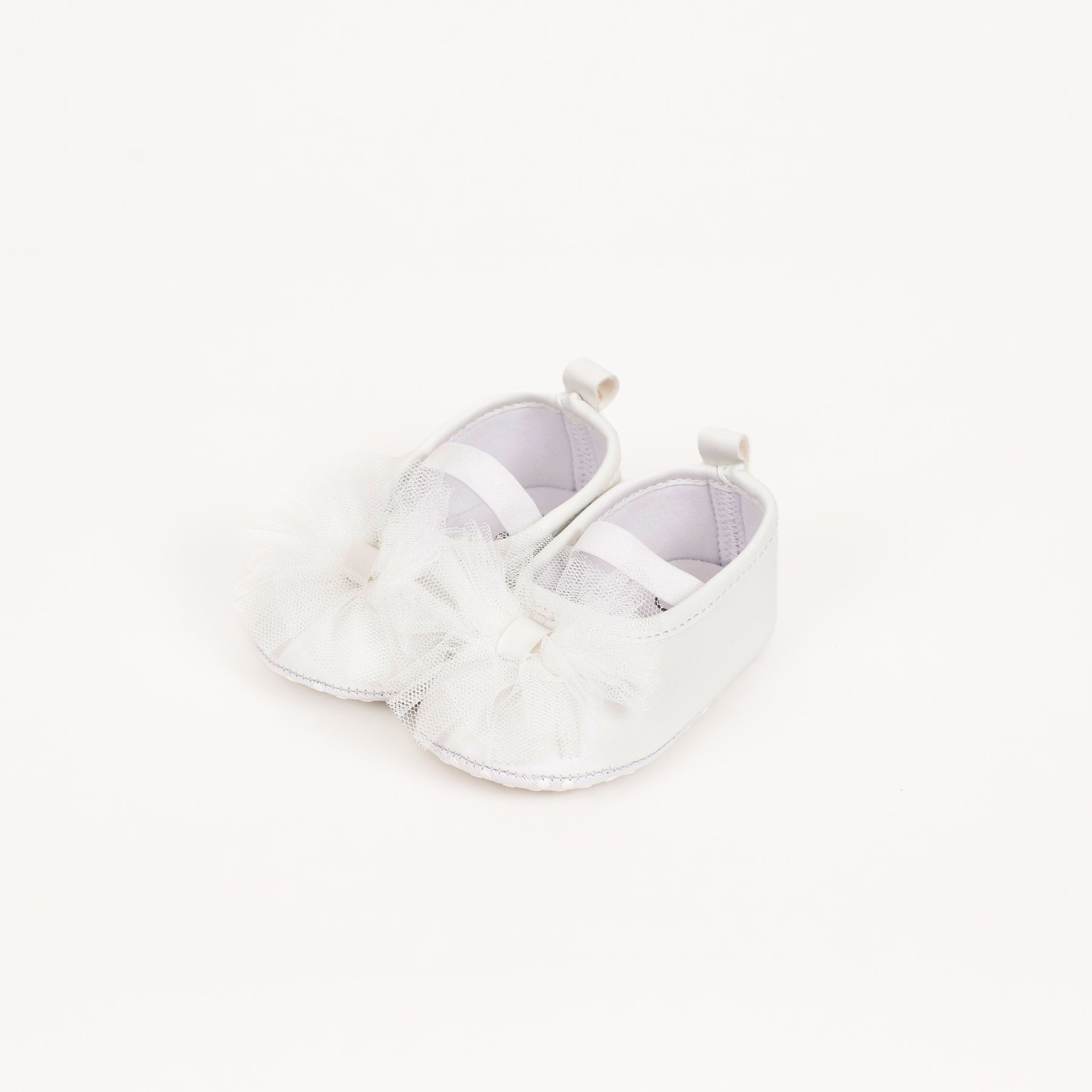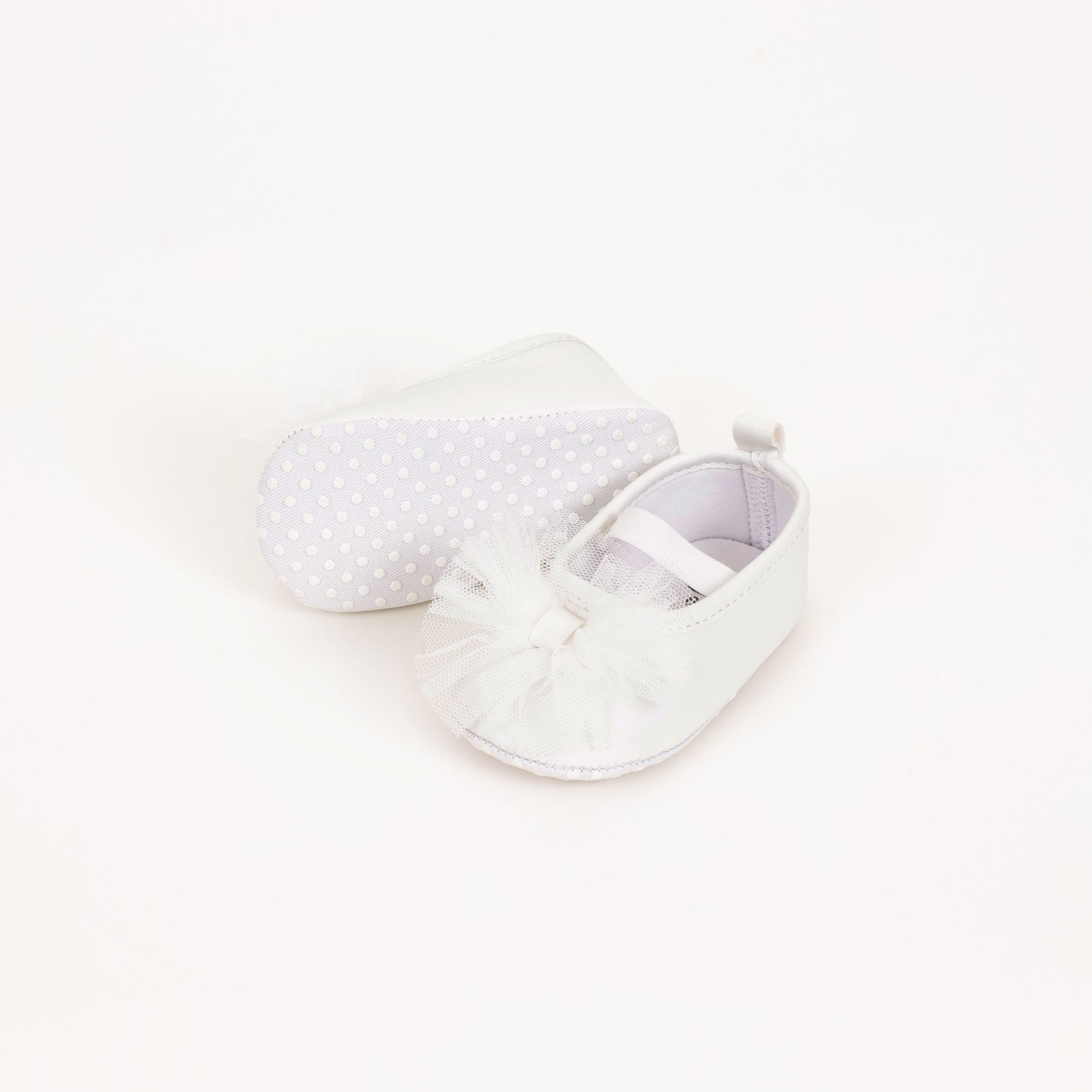 נעלי בובה מתוקות לבנות עם פפיון בד טול. נעלי תינוקות קסומות לכל לוק חגיגי או ללוק פשוט שמבקש אקססוריז יחודיים. נעליים רכות עם גומי אלסטי מלמעלה. עשויות פוליאוריטאן.