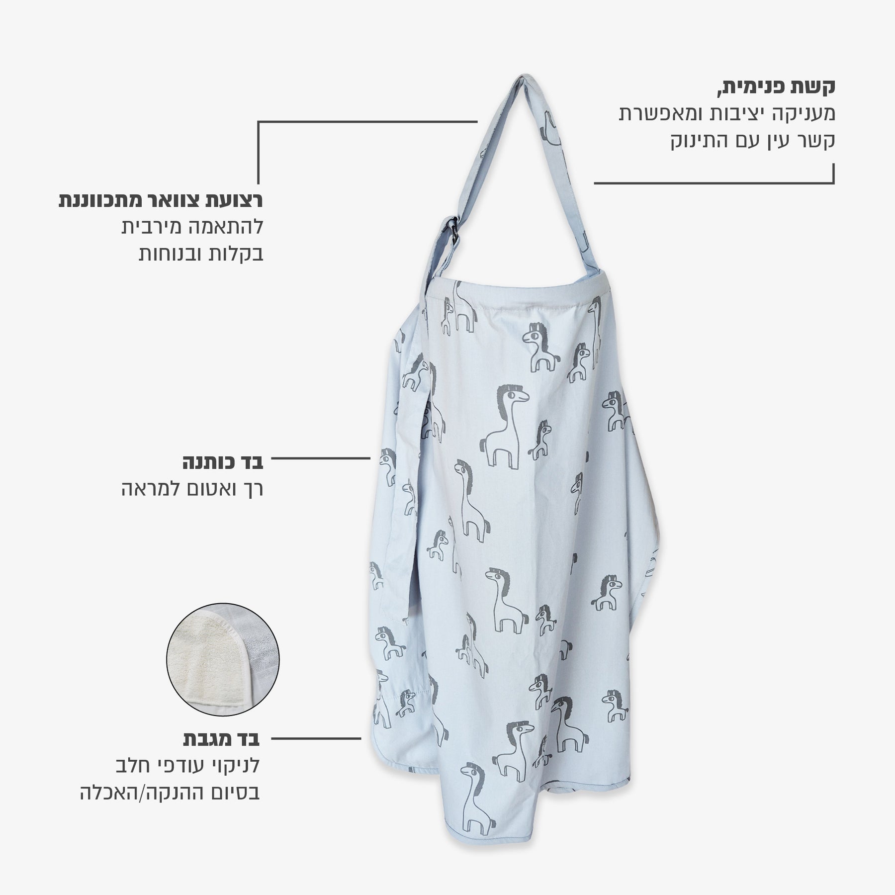 עם סינר ההנקה של Simply good את יכולה להניק בכל מקום ולהרגיש הכי בנוח שאפשר. הסינר גדול ועוטף ומכסה אותך ואת תינוקך כך שתוכלי להניק בפרטיות בכל מקום. קשת פנימית מובנת המעניקה יציבות ומאפשרת לשמור על קשר עין רציף עם התינוק בזמן ההנקה. רצועת צוואר הניתנת להתאמה מירבית בקלות ובנוחות. בד מגבת בפינת הסינר לניקוי עודפי חלב בסיום ההנקה.
