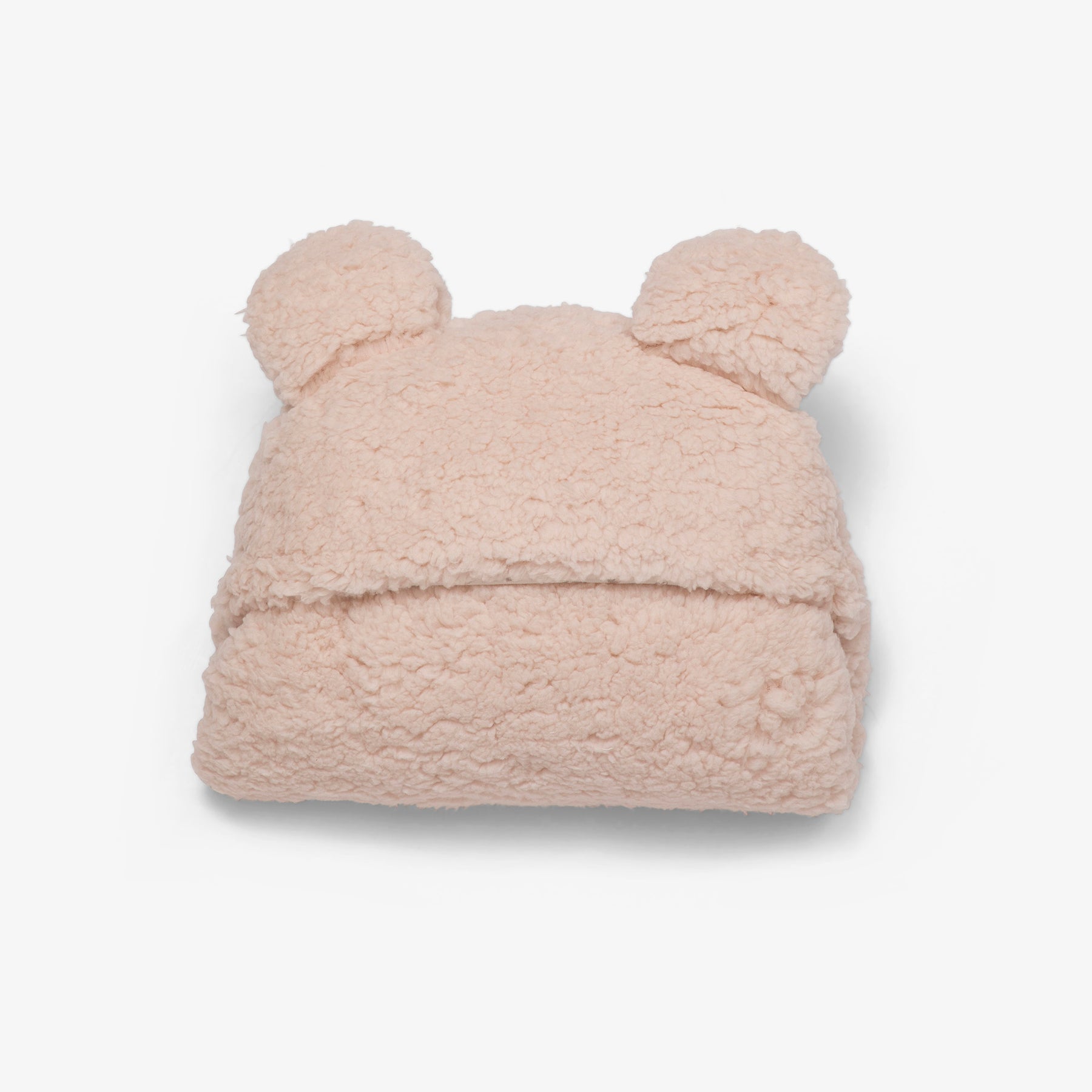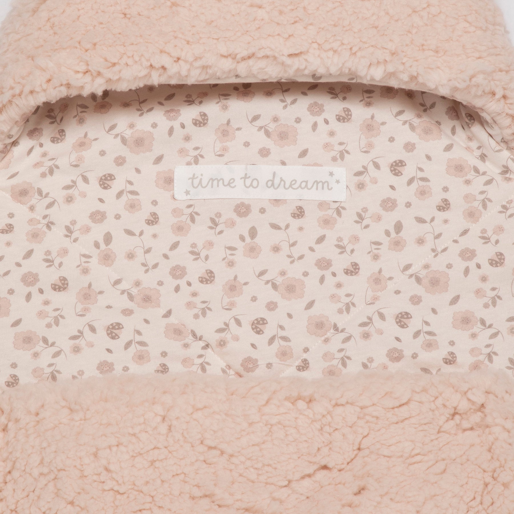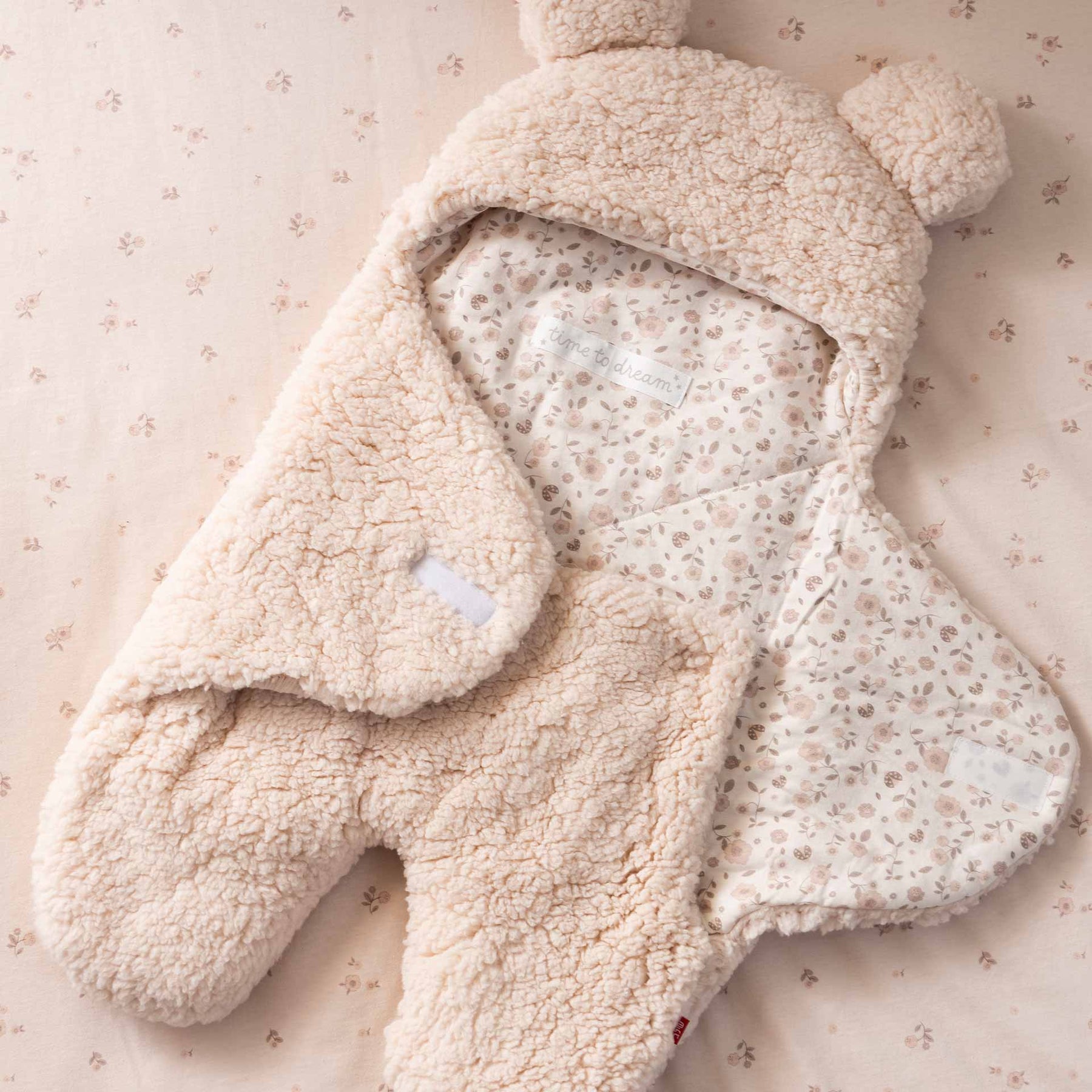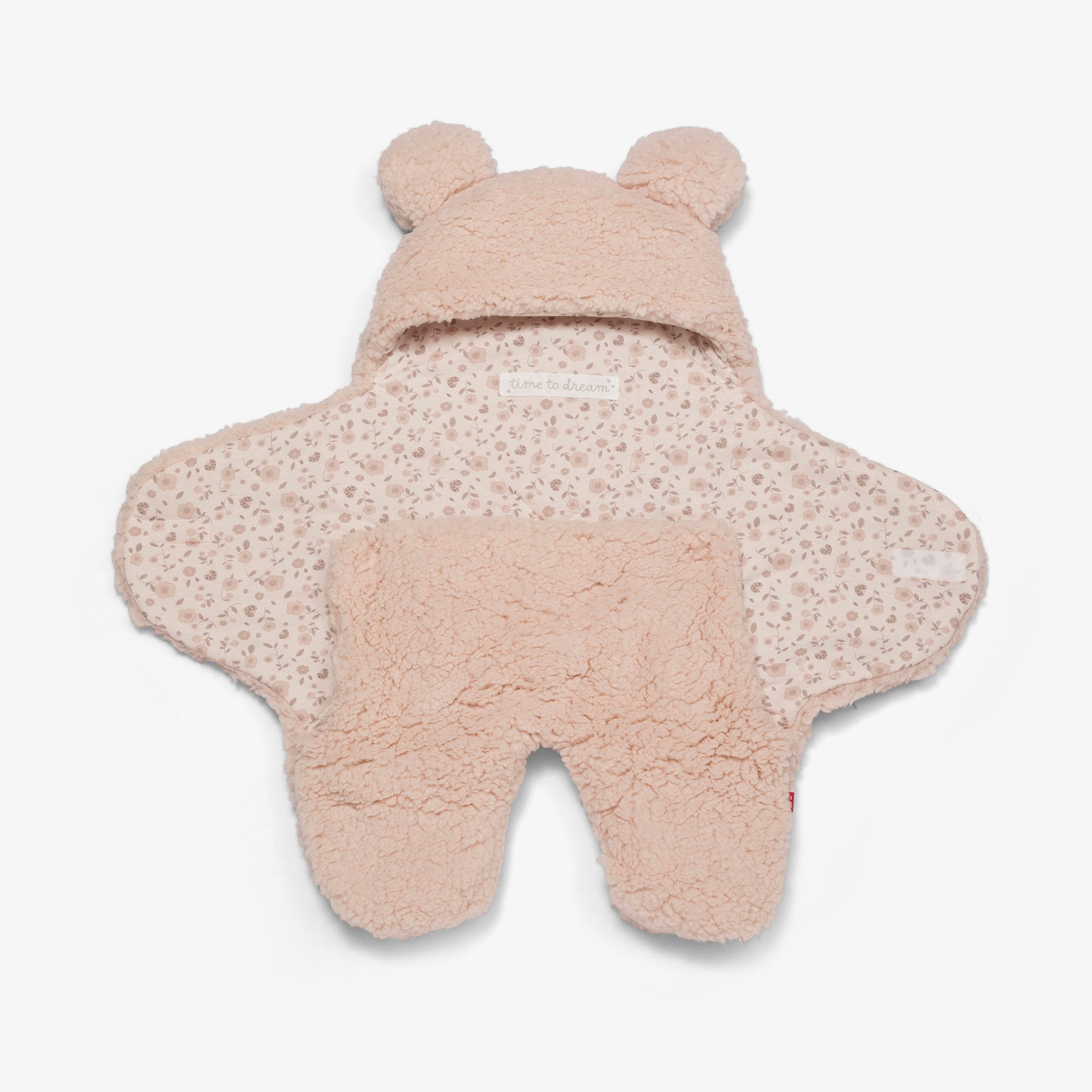 עיטופון swaddle לניו בורן המעניק תחושת רוגע ובטחון. העיטופון בדמות דובי ועשוי פרוות שרפא בצבע ורוד ועם בטנה בהדפס פרחים. 100% פוליאסטר+בטנת מילוי 100% כותנה. מידה: 65X70 סמ.