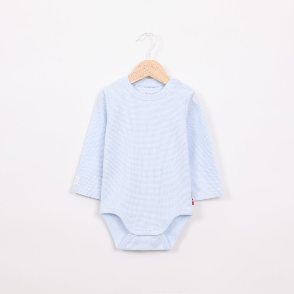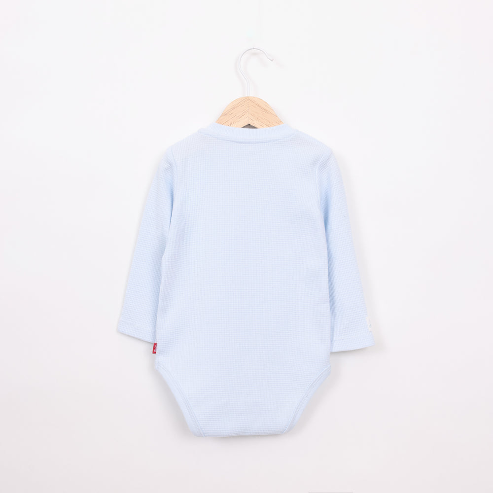 בגד גוף לתינוקות עם שרוולים ארוכים בגוון תכלת רך ונעים במיוחד.