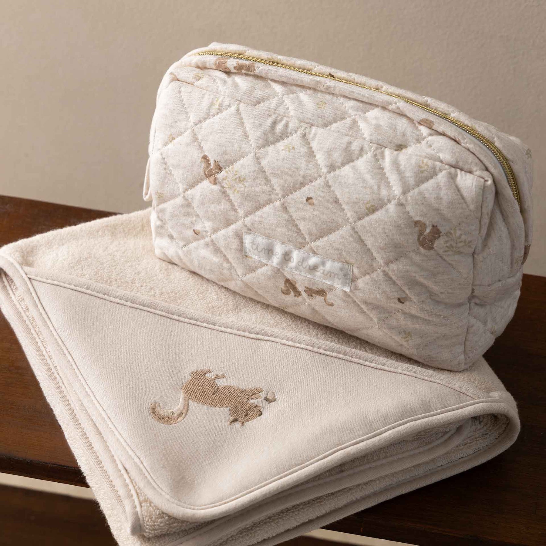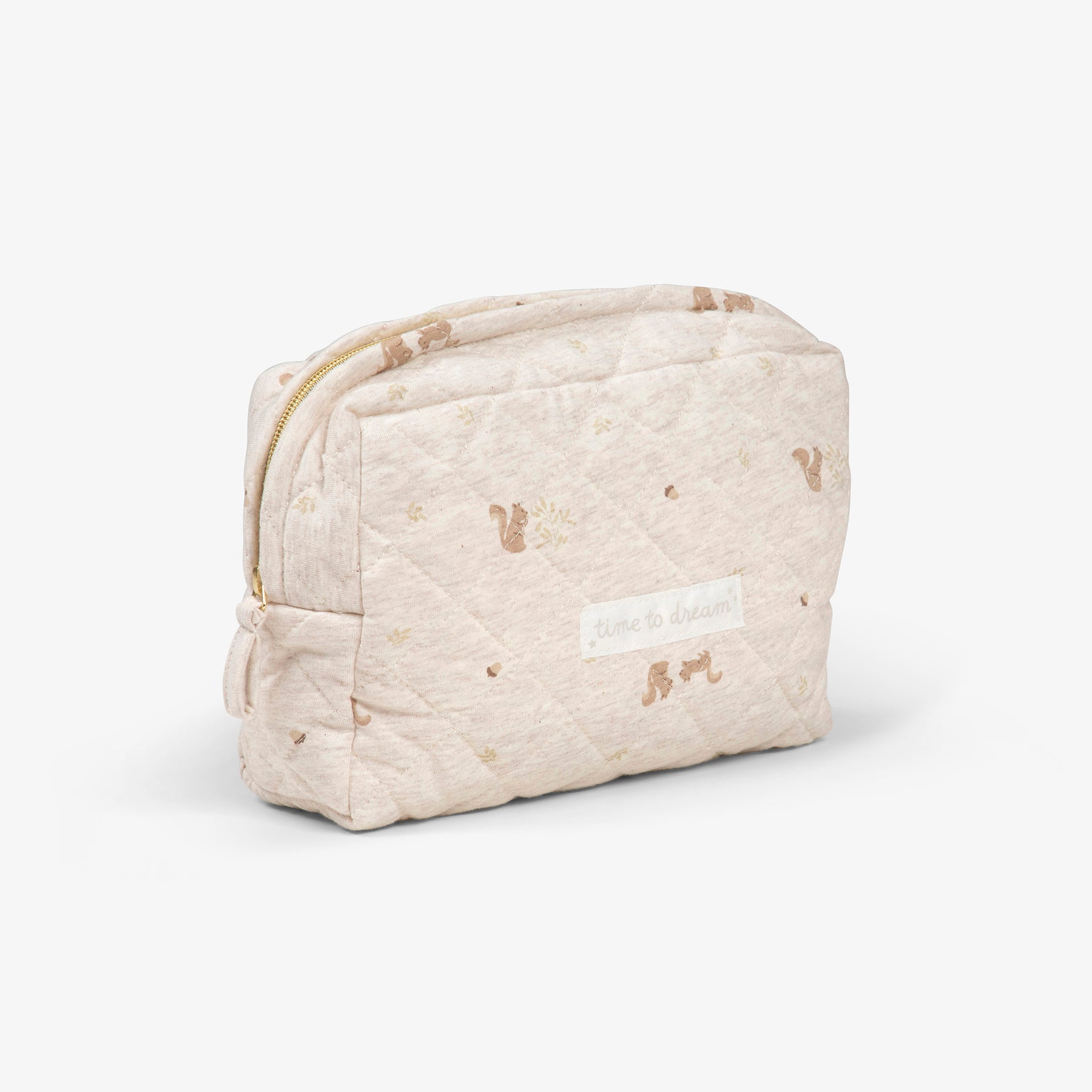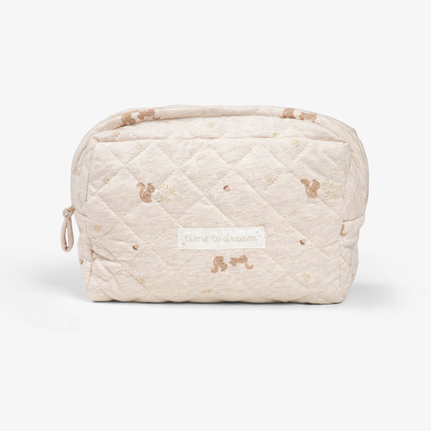 תיק אחסון רב שימושי לאחסון פריטים חיונים כגון פריטי החתלה רחצה וקוסמטיקה. התיק בטקסטורת קווילט ובהדפס סנאים ונסגר באמצעות רוכסן. מידה: 16X24. הרכב בד: כיסוי 100% כותנה+ מילוי 100% פוליאסטר.