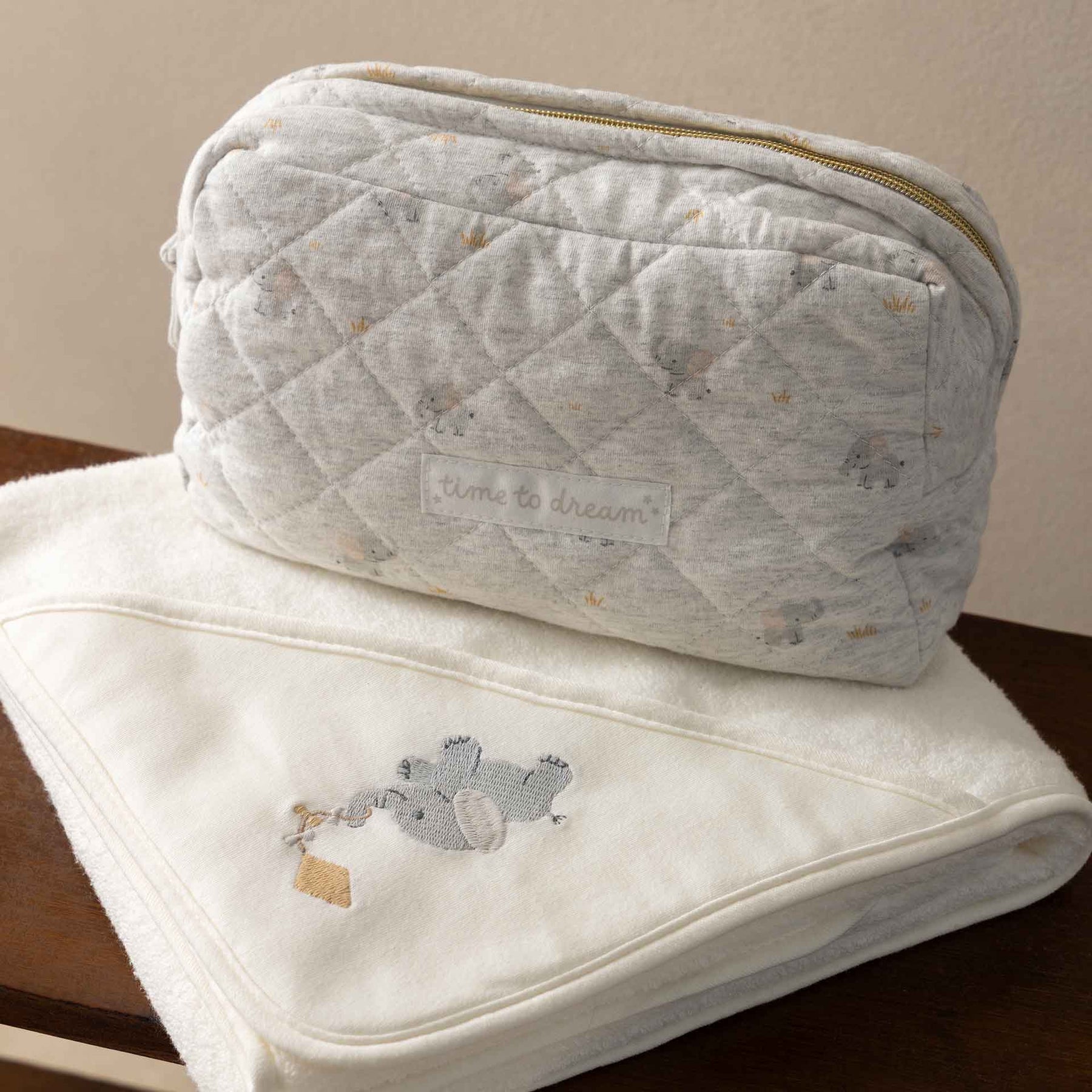 תיק אחסון רב שימושי לאחסון פריטים חיונים כגון פריטי החתלה רחצה וקוסמטיקה. התיק בטקסטורת קווילט ובהדפס פילים ונסגר באמצעות רוכסן. מידה: 16X24. הרכב בד: כיסוי 100% כותנה+ מילוי 100% פוליאסטר.