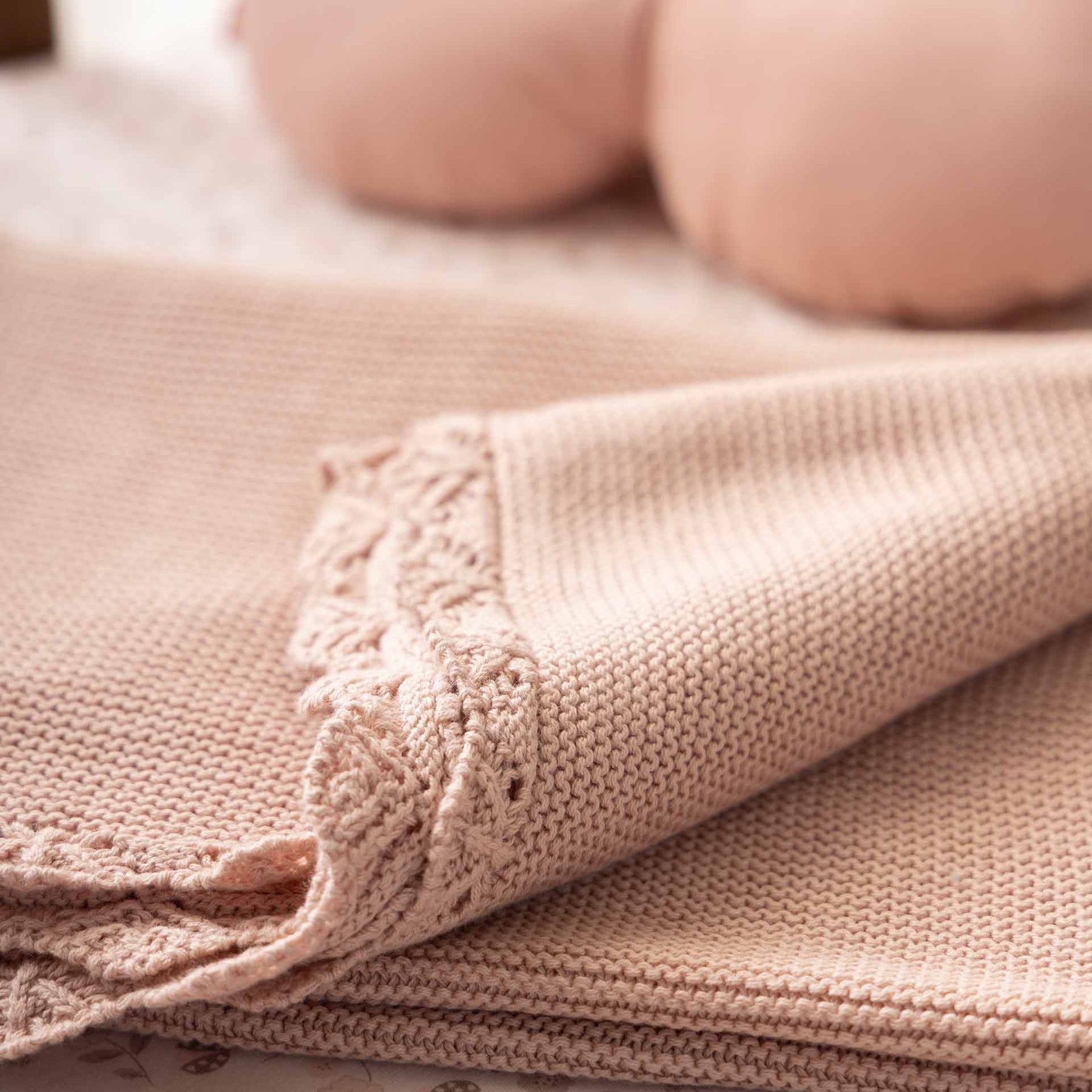 שמיכה סרוגה לעגלה בצבע ורוד ועם מסגרת מעוטרת. מידה: 76X100 סמ. 100% כותנה.
