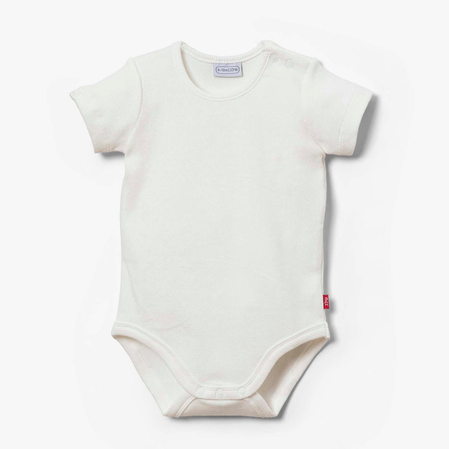 בגד גוף ריב קצר בסגנון איריס. הבגד בצבע פסים חלב ועם פאץ' בכיתוב אנגלית בקצה השרוול.