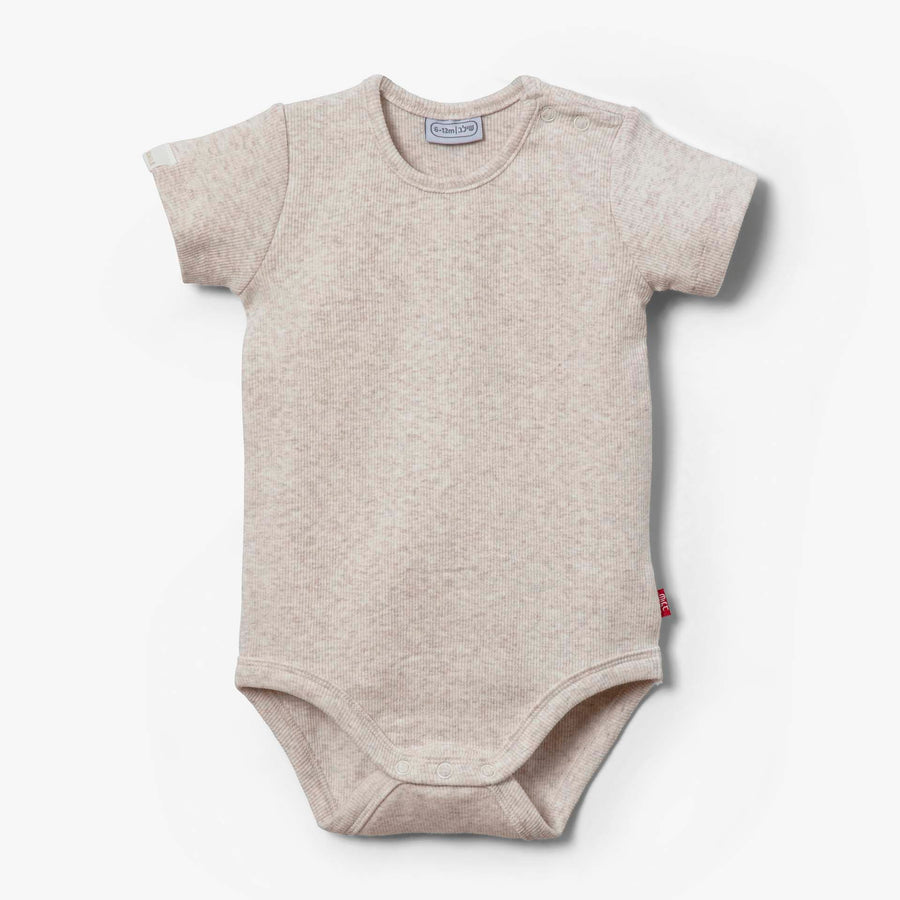 בגד גוף ריב קצר בצבע קרם מלאנז' עם פאץ' בכיתוב אנגלית בקצה השרוול. לבגד סגירת לחצניות תיקתק.