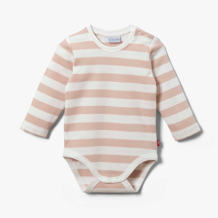 בגד גוף פסים ארוך עם פאץ' בכיתוב אנגלית בסיומת השרוול. לבגד סגירת לחצניות תיק-תק.