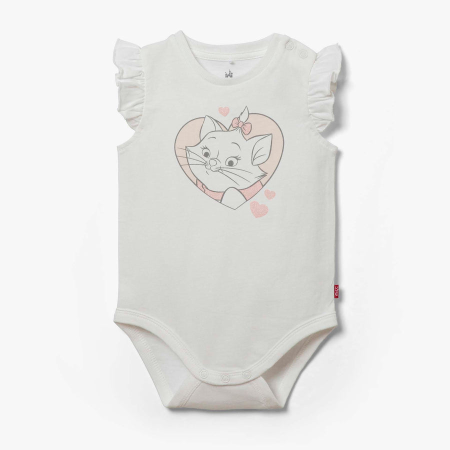 בגד גוף קצר עם כתפיות מלמלה רחבות. הבגד בצבע אוף וויט ובהדפס של החתולה מארי.