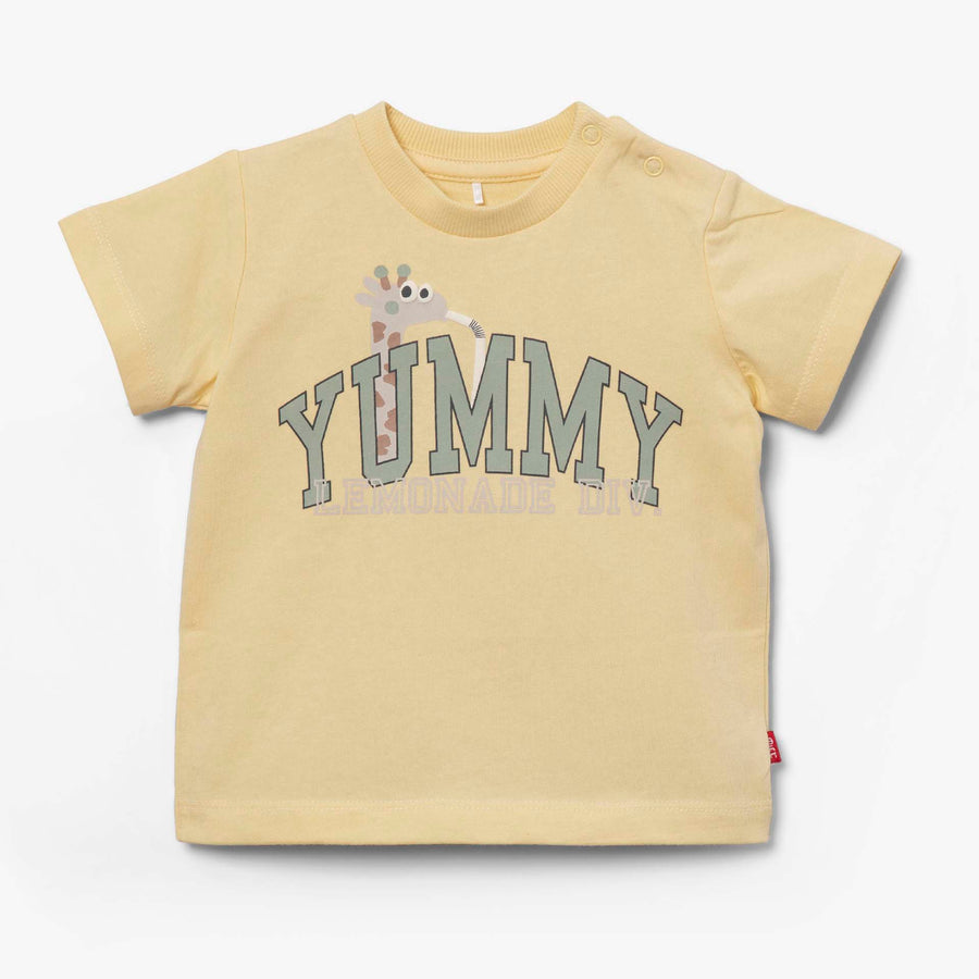 חולצה קצרה בצבע צהוב בננה ובהדפס ג'ירפה וכיתובים באנגלית. לחולצה מפתח צווארון עגול.