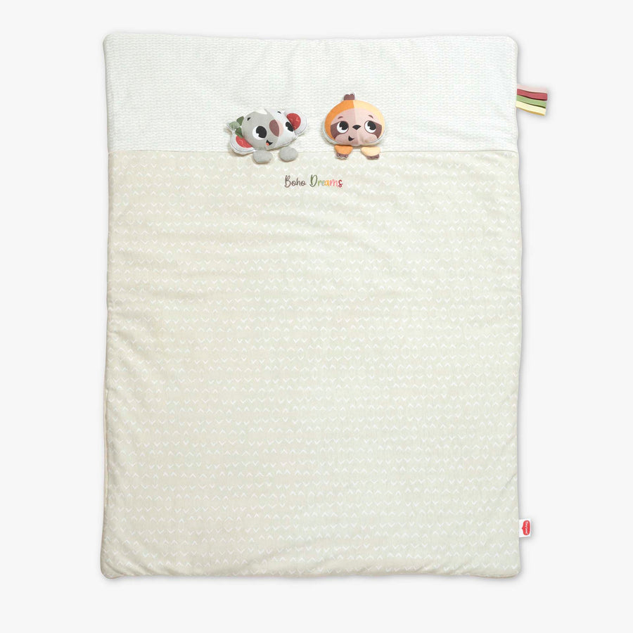 שמיכה לעריסה עם מילוי בעיצוב בוהו של טייני לאב עם גוונים חמימים נגיעות טבעיות וטקסטורות נעימות שיוצרות סביבה רגועה והרמונית. גודל 80X62 סמ. כיסוי חיצוני 100% כותנה. מילוי 100% פוליאסטר.