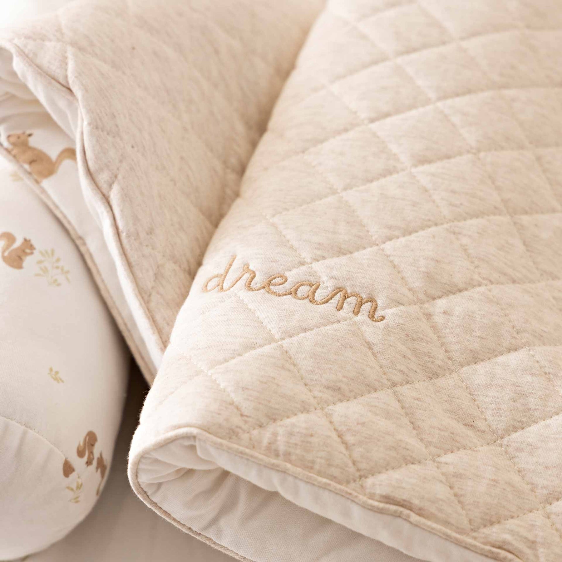 שמיכה עם מילוי לעריסת תינוק/ת בצבע קרם ובעיצוב סנאים. מידה 80X62 סמ. הרכב בד כיסוי 100% כותנה+ מילוי 100 הוליפייבר.