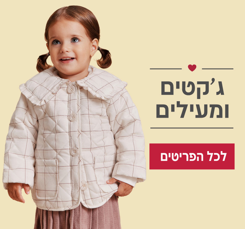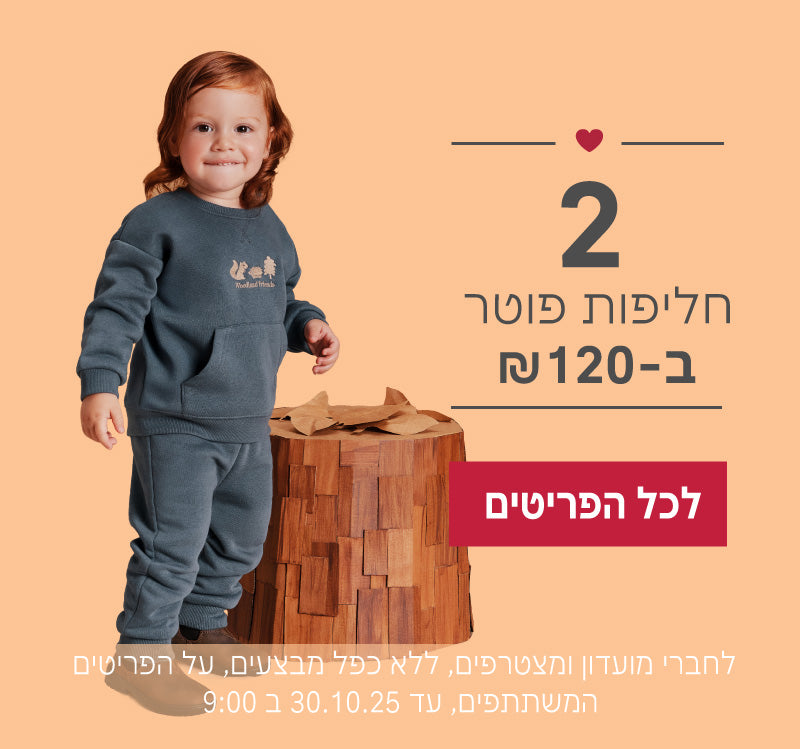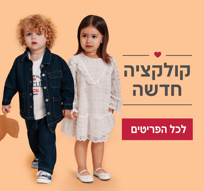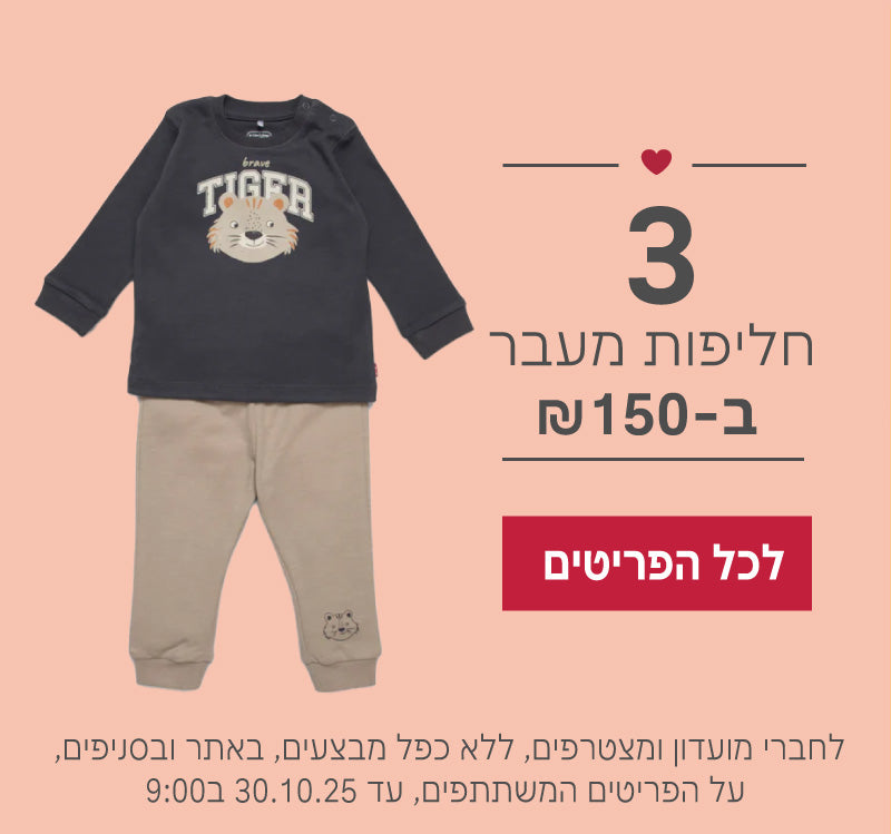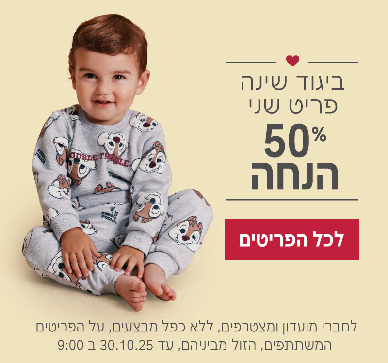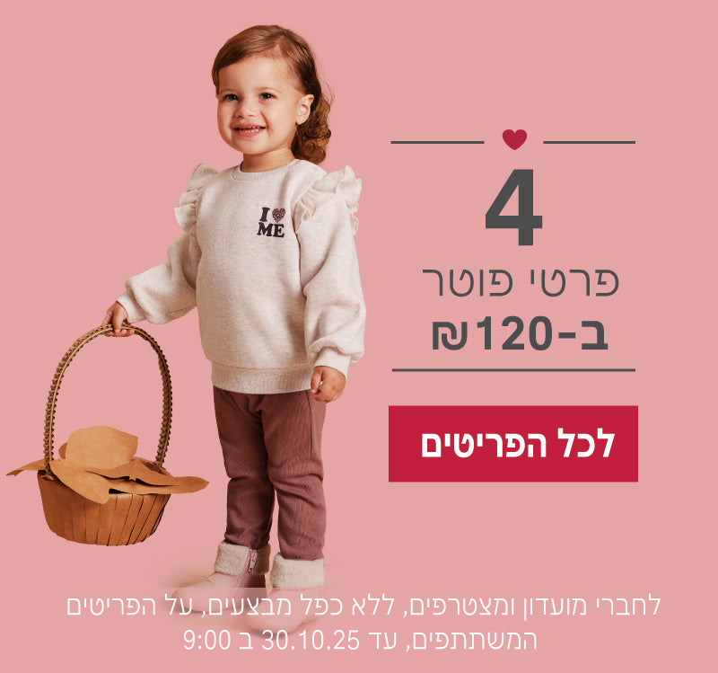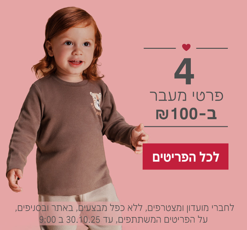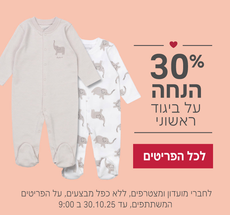 30% הנחה על ביגוד ראשוני 4 פריטי מעבר ב- 100 ₪ 3 חליפות מעבר ב-150 ₪ 2 חליפות פוטר ב- 120 ₪ 4 פריטי גן ב- 120 ₪ הקולקציה החגיגית קולקציית דיסני אוברולים נעליים