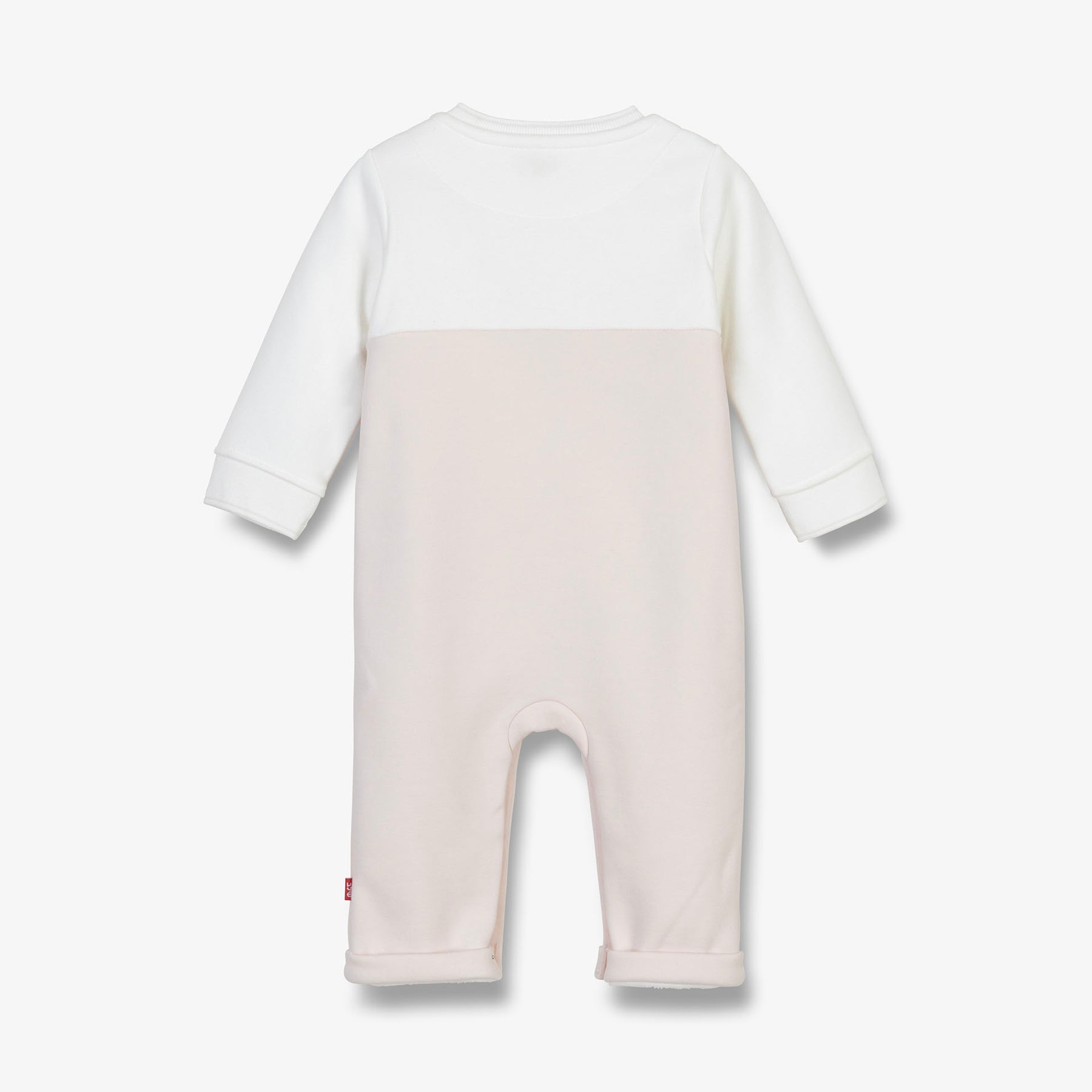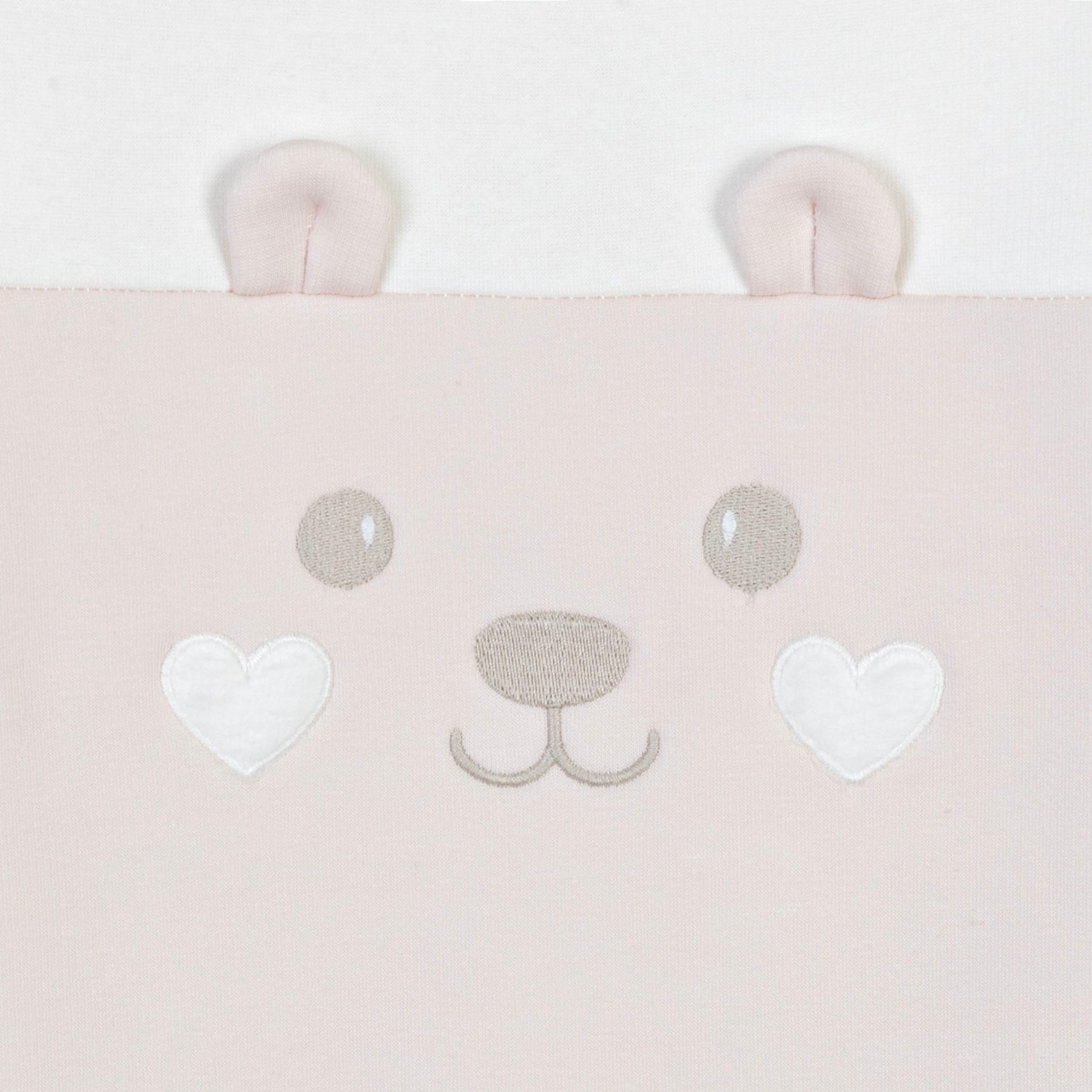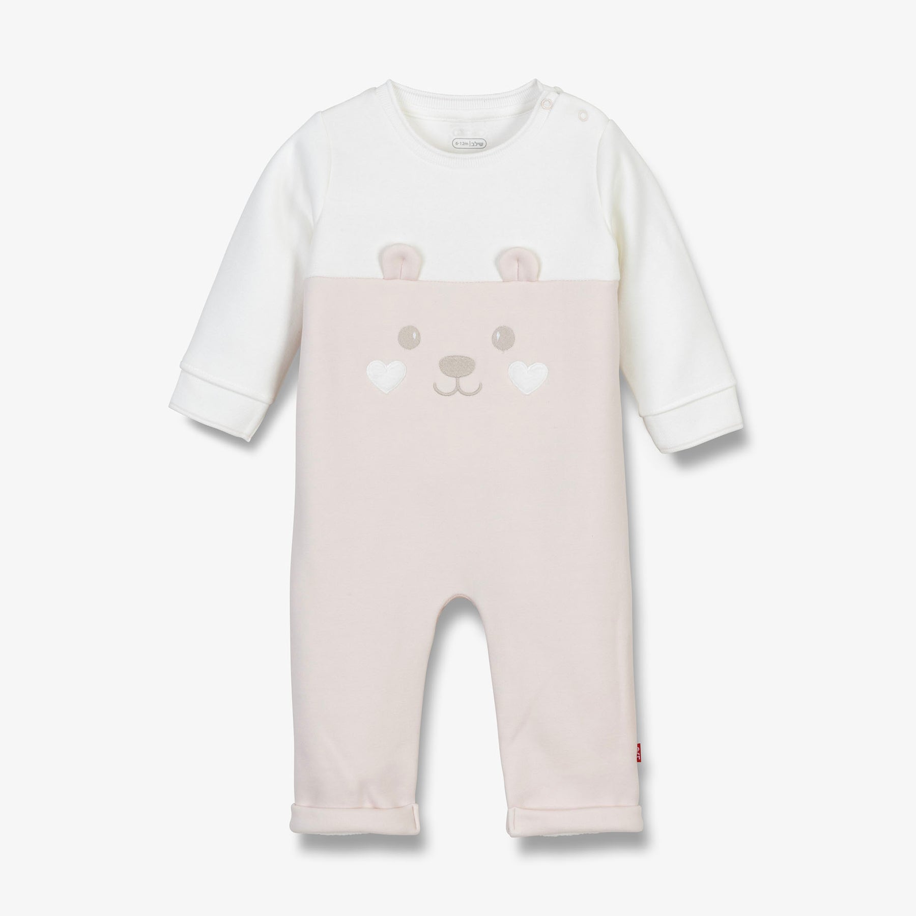 אוברול דובי ורוד עם סגירת לחצניות. לדובי אוזניים מובלטות.
