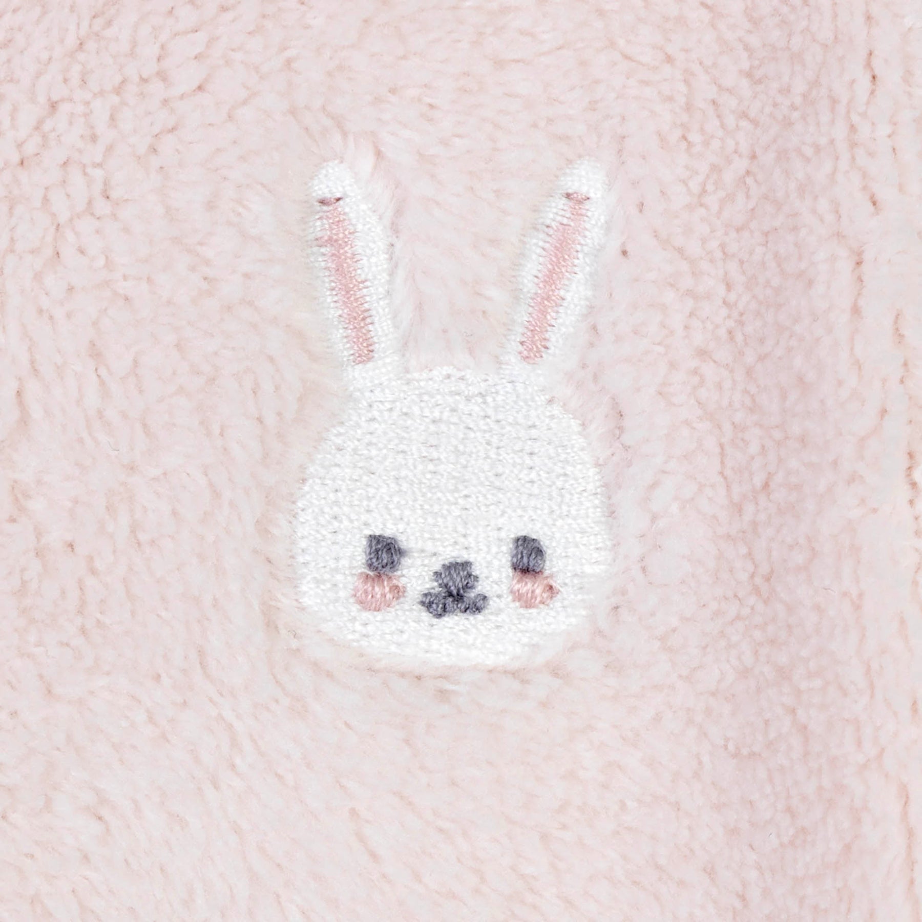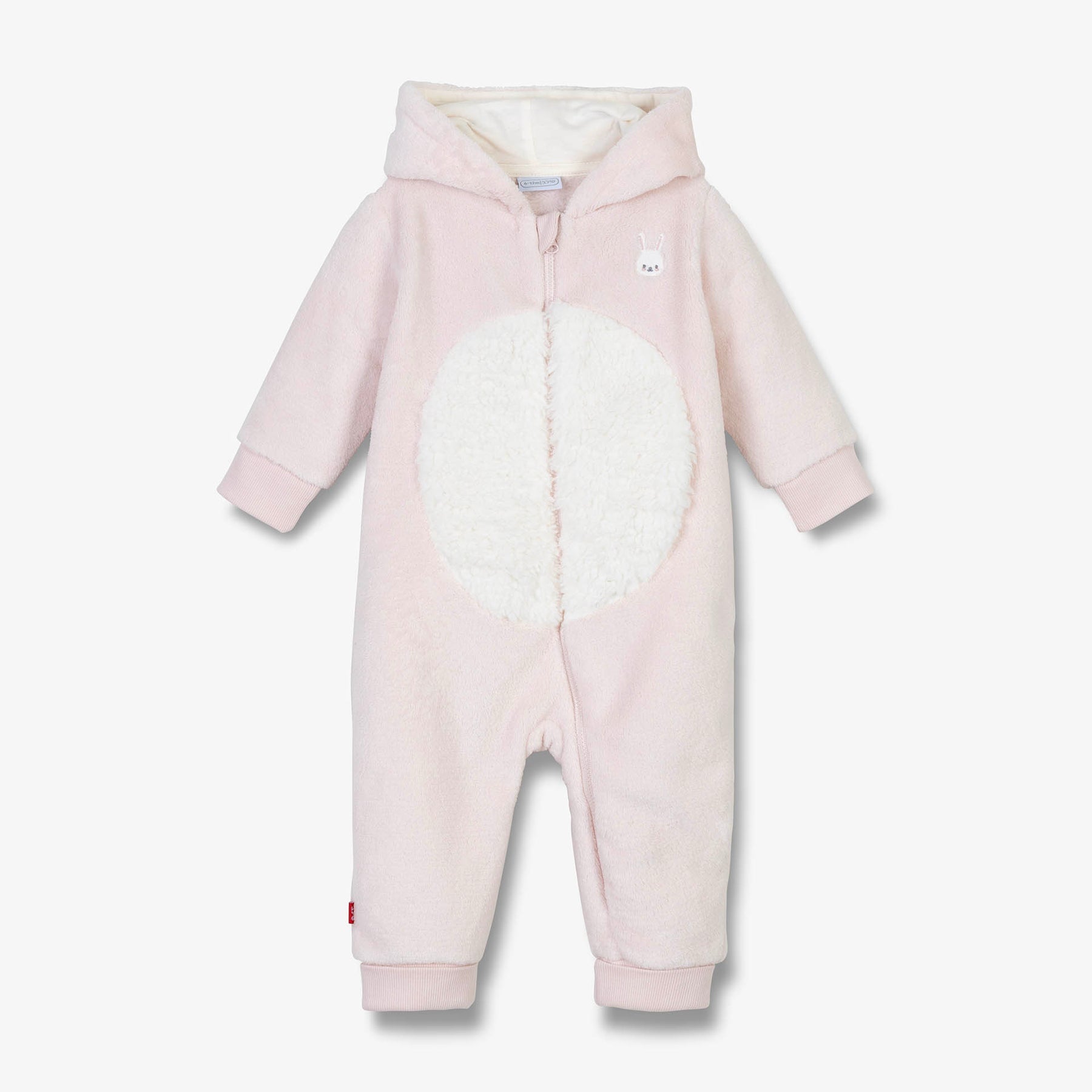 אוברול ואנזי ארוך עם כובע קפוצ'ון בדמות ארנבת. האוברול בצבע ורוד ועם סגירת רוכסן.