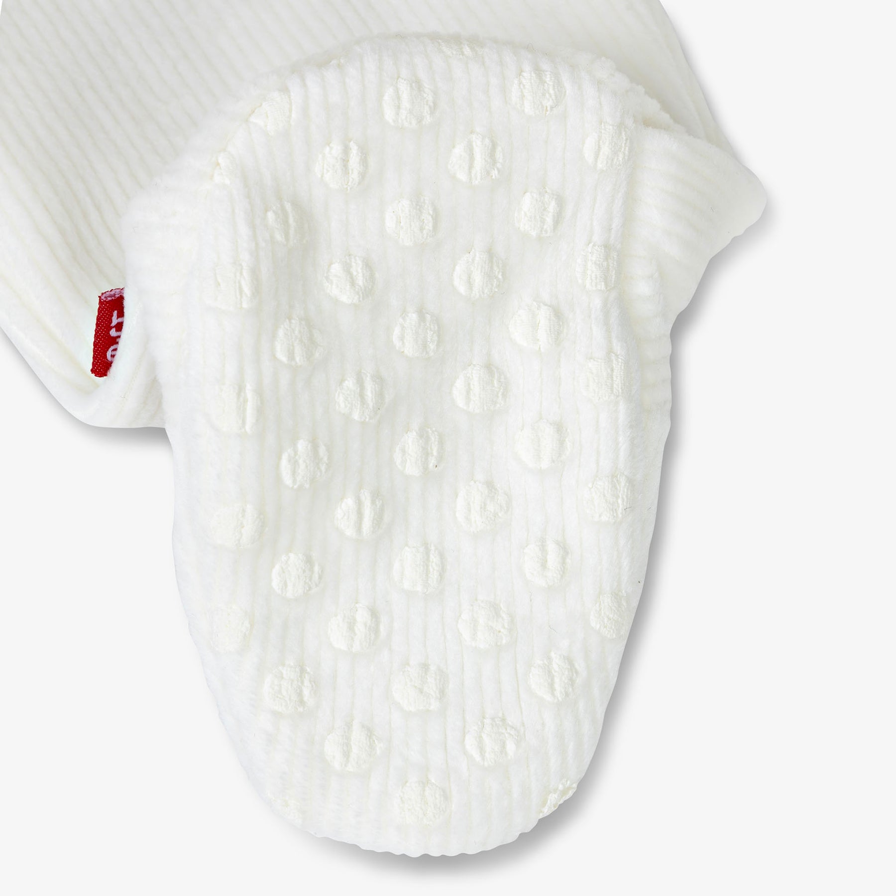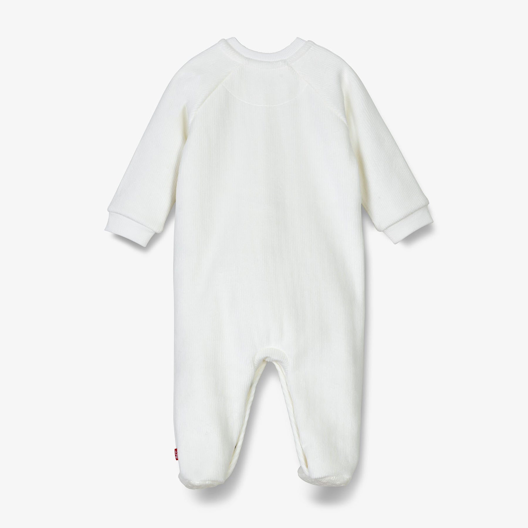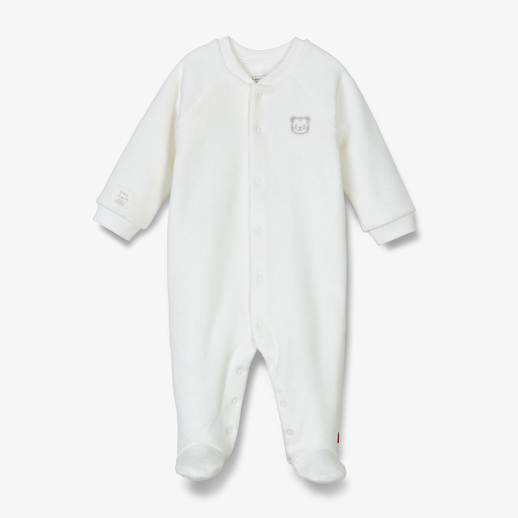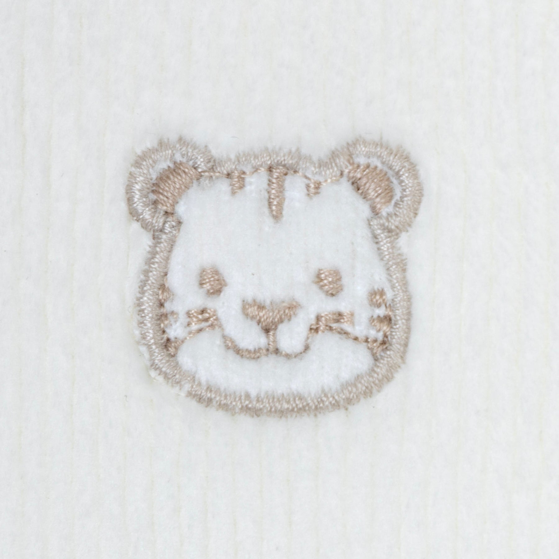 אוברול רגלית קטיפתי בצבע שמנת ועם פאץ' בדמות נמר. לאוברול סגירת לחצניות להלבשה נוחה.