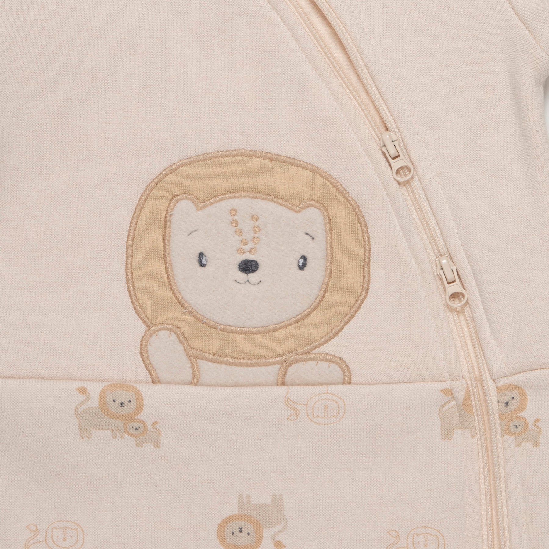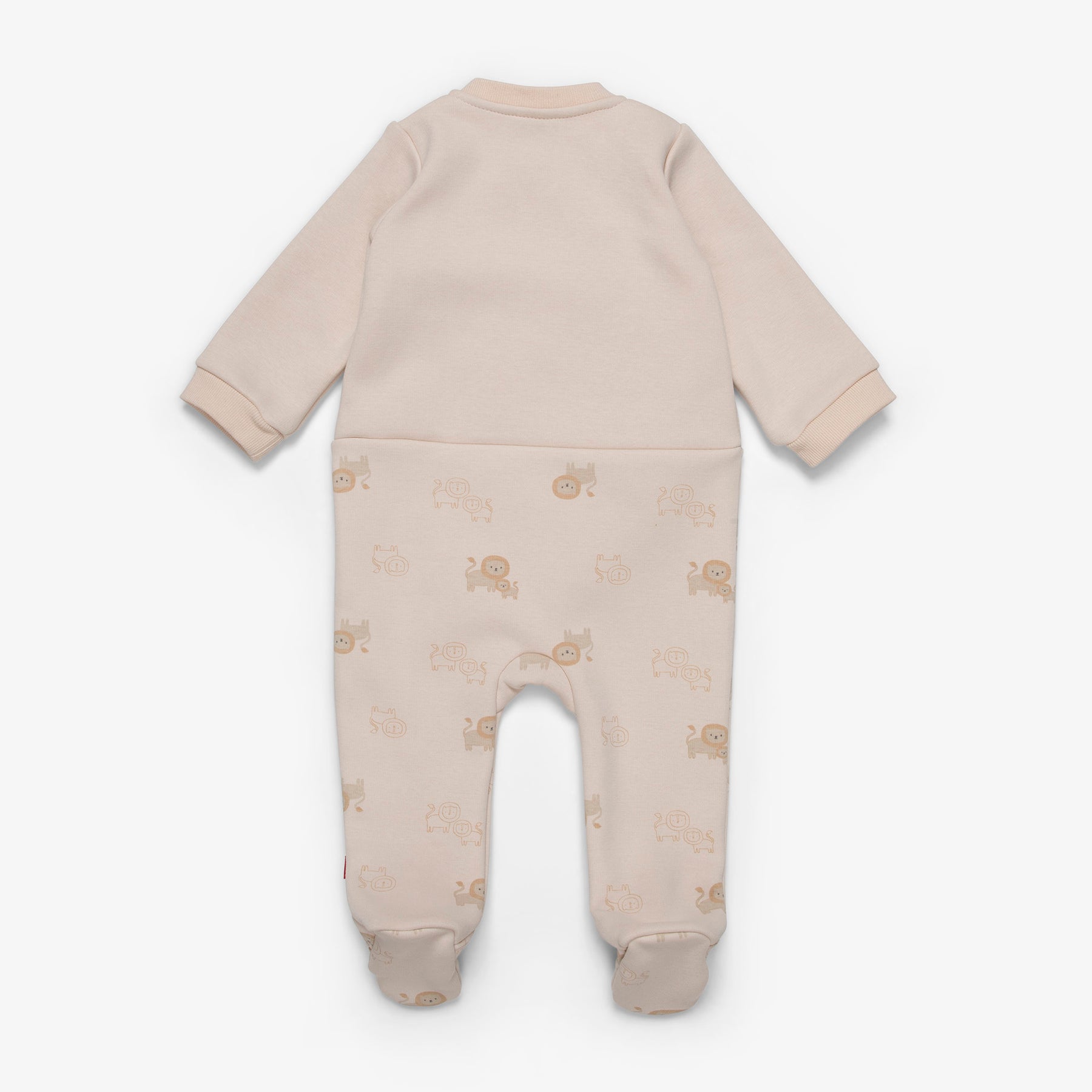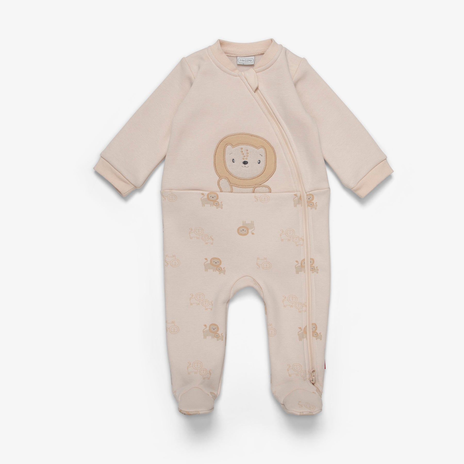 אוברול רגליות ארוך בצבע אבן ובהדפס אריות. לאוברול סגירת רוכסן כפול להלבשה נוחה וקלה.
