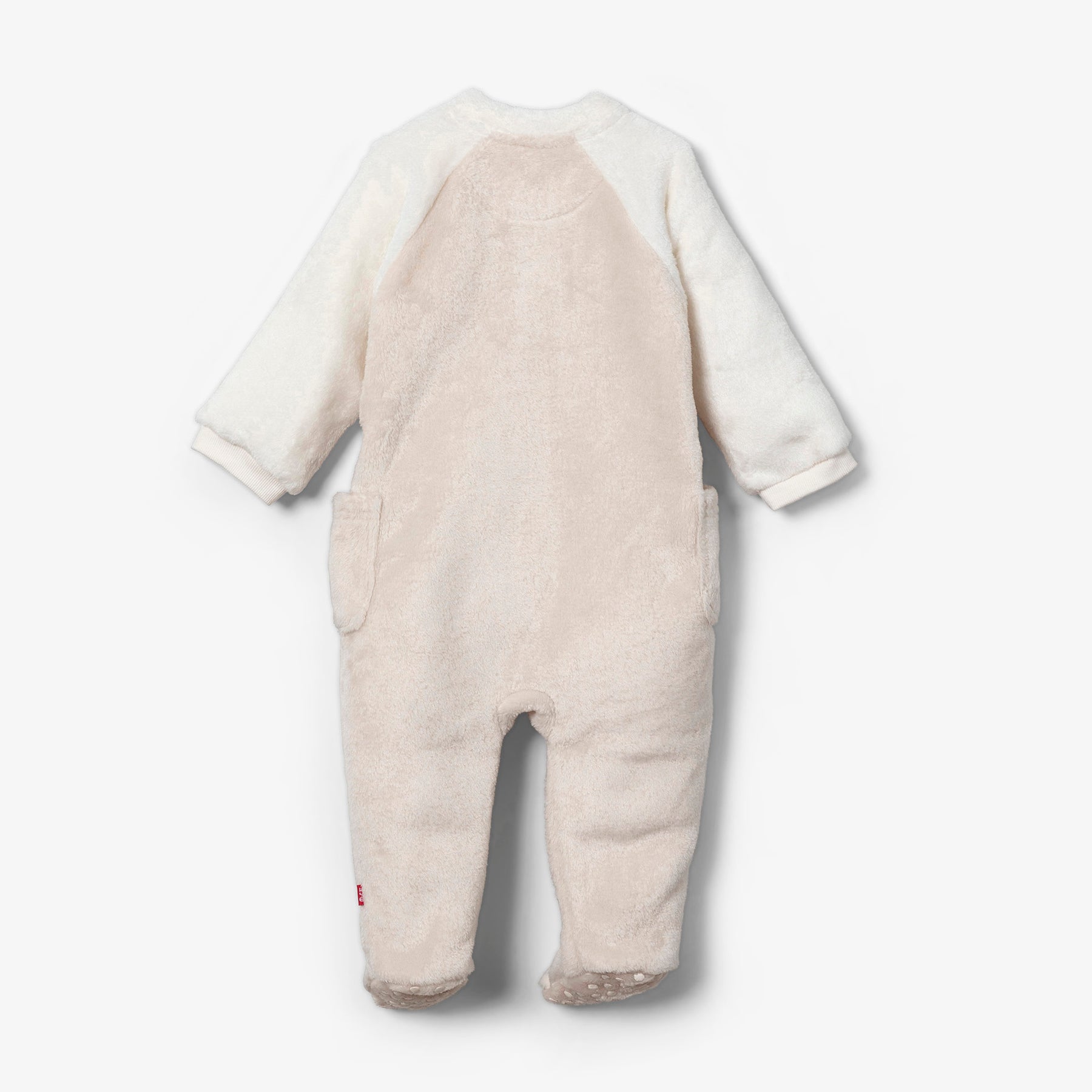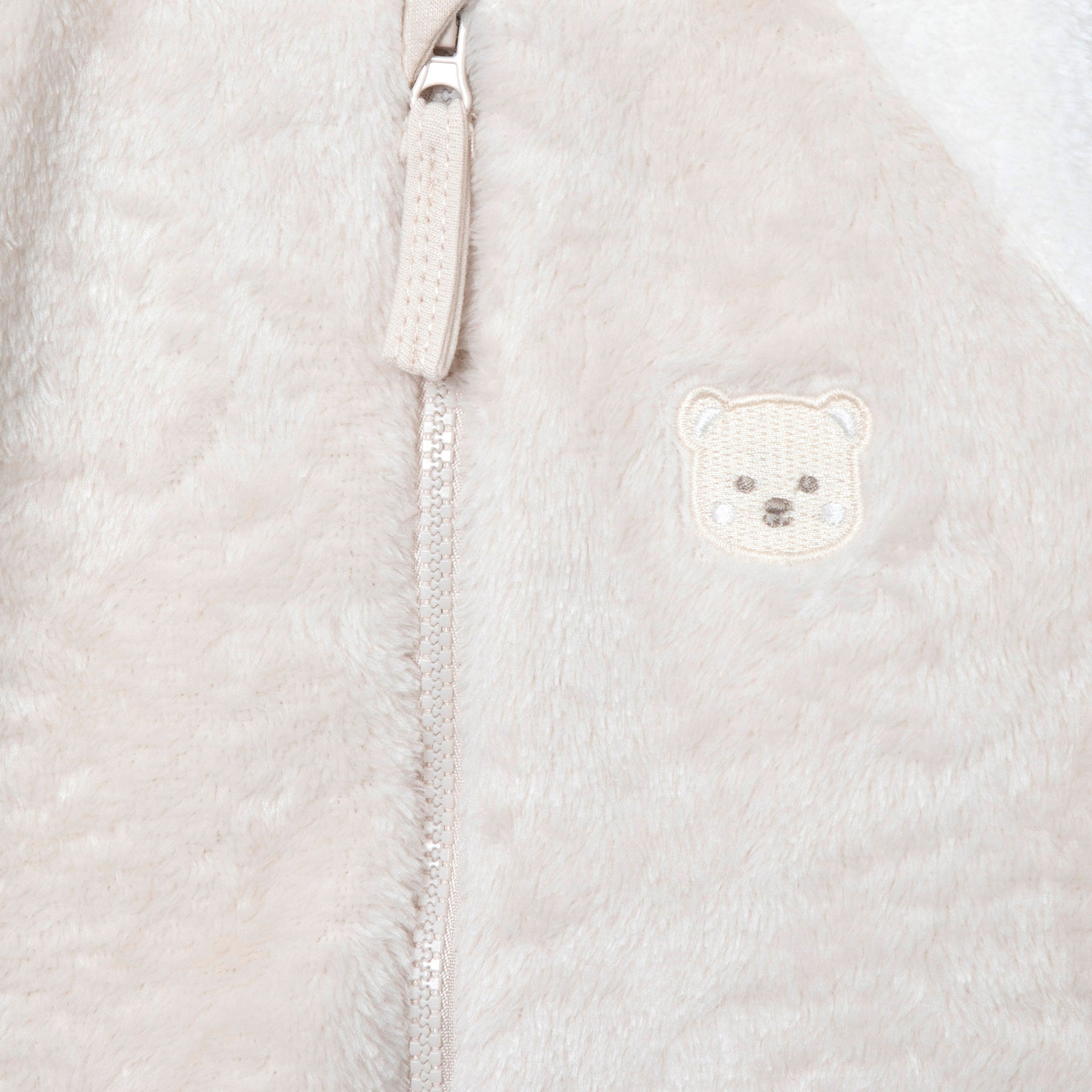 אוברול רגלית פרוותי עם כיסים בצבע אבן ורקמת דובון. לאוברול סגירת רוכסן וסוליות למניעת החלקה.