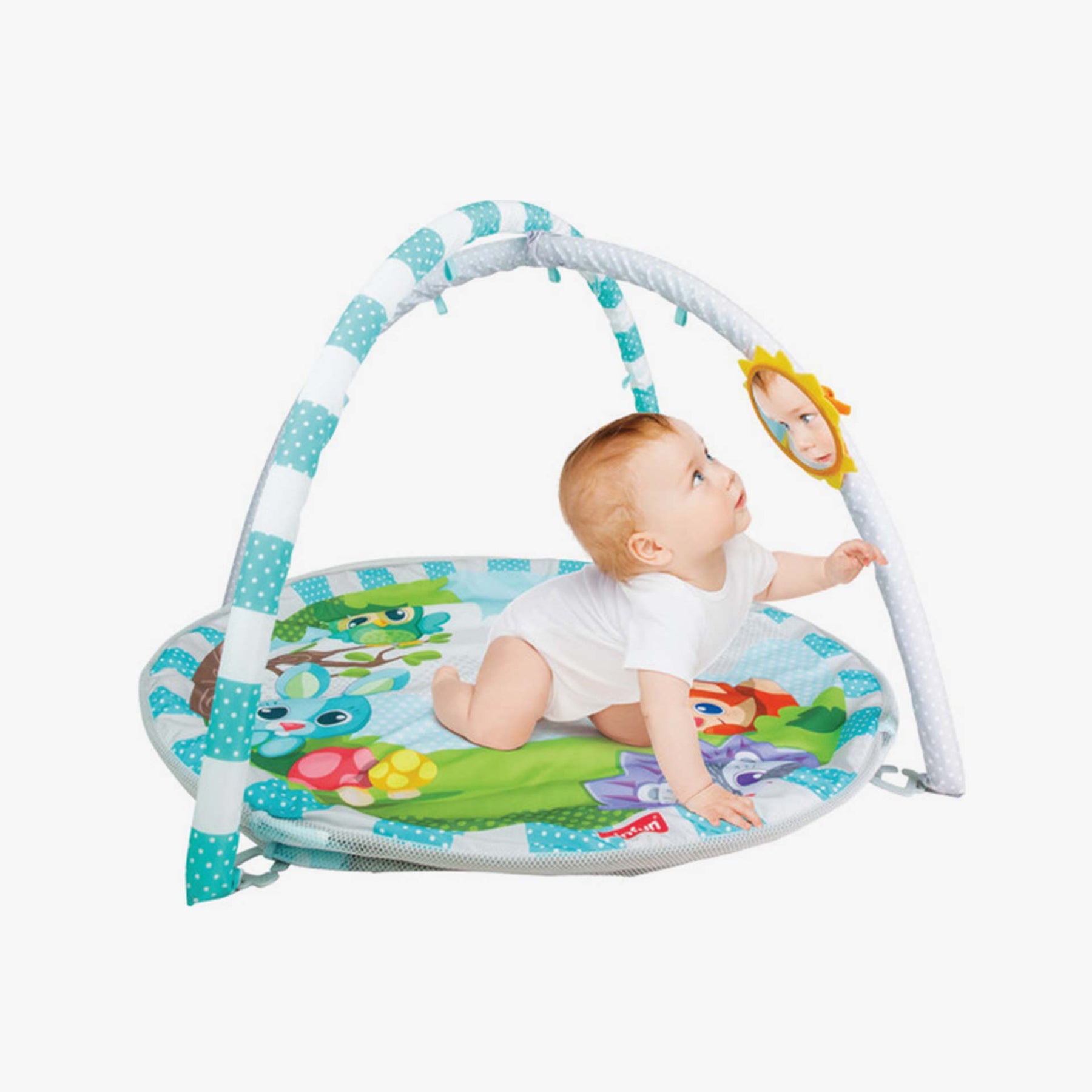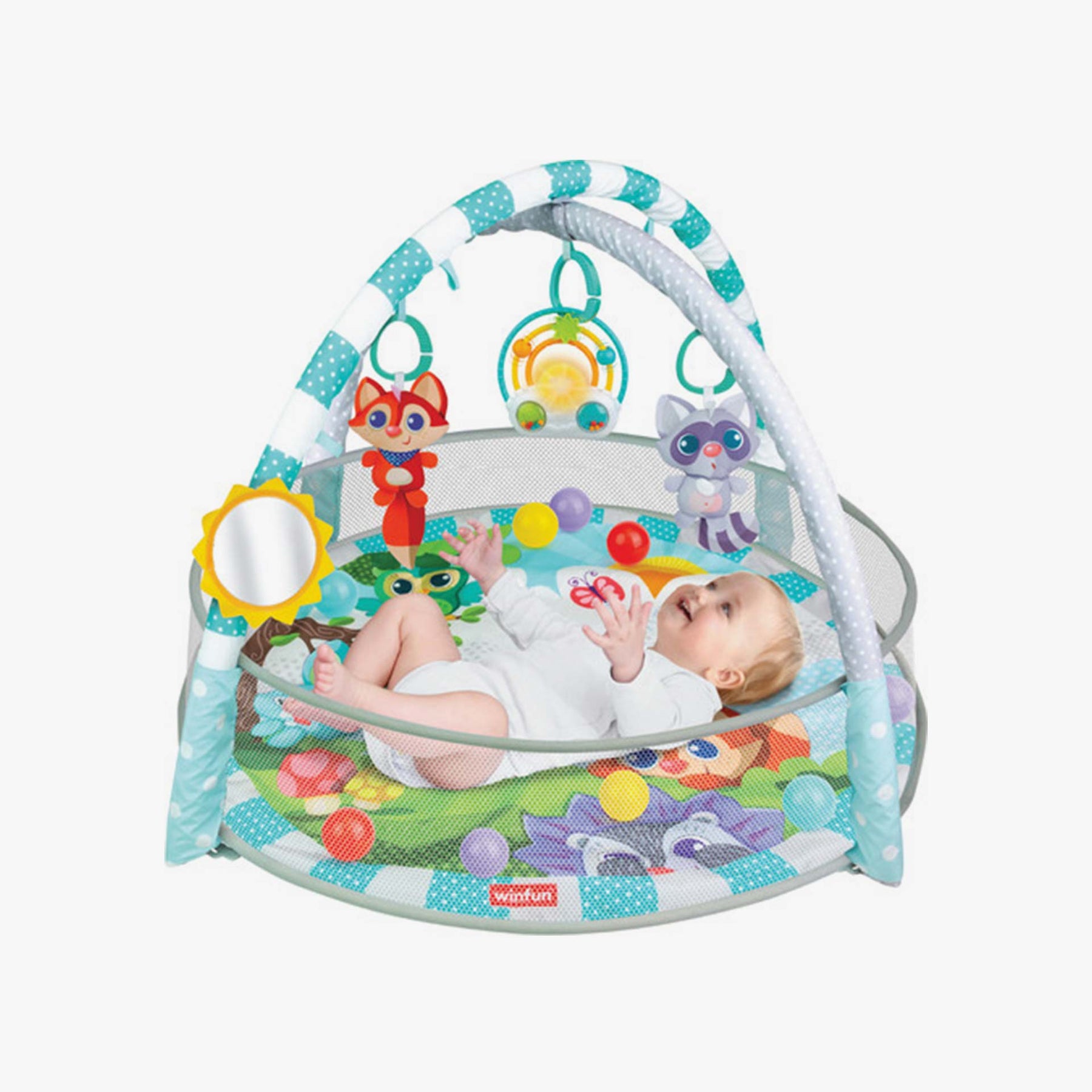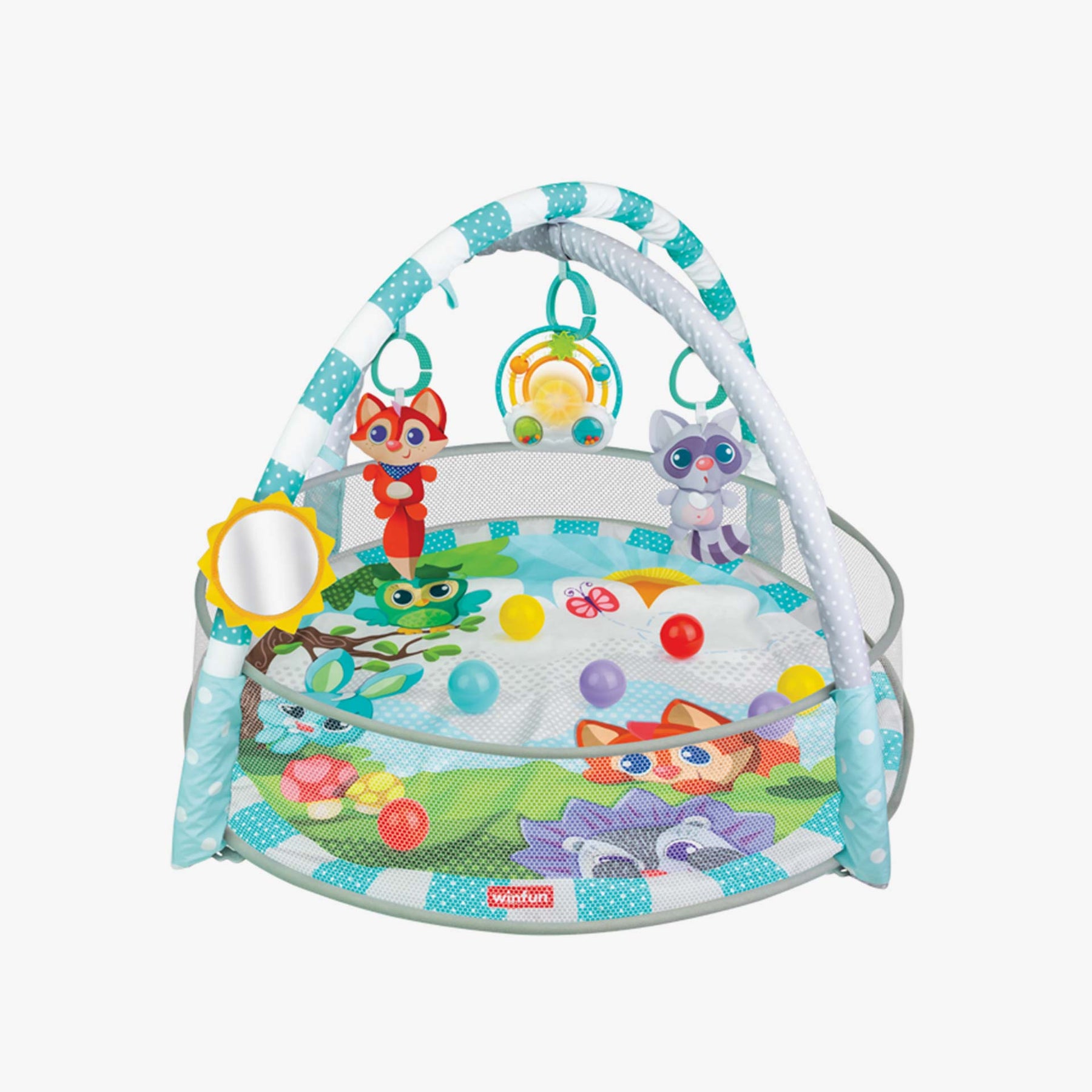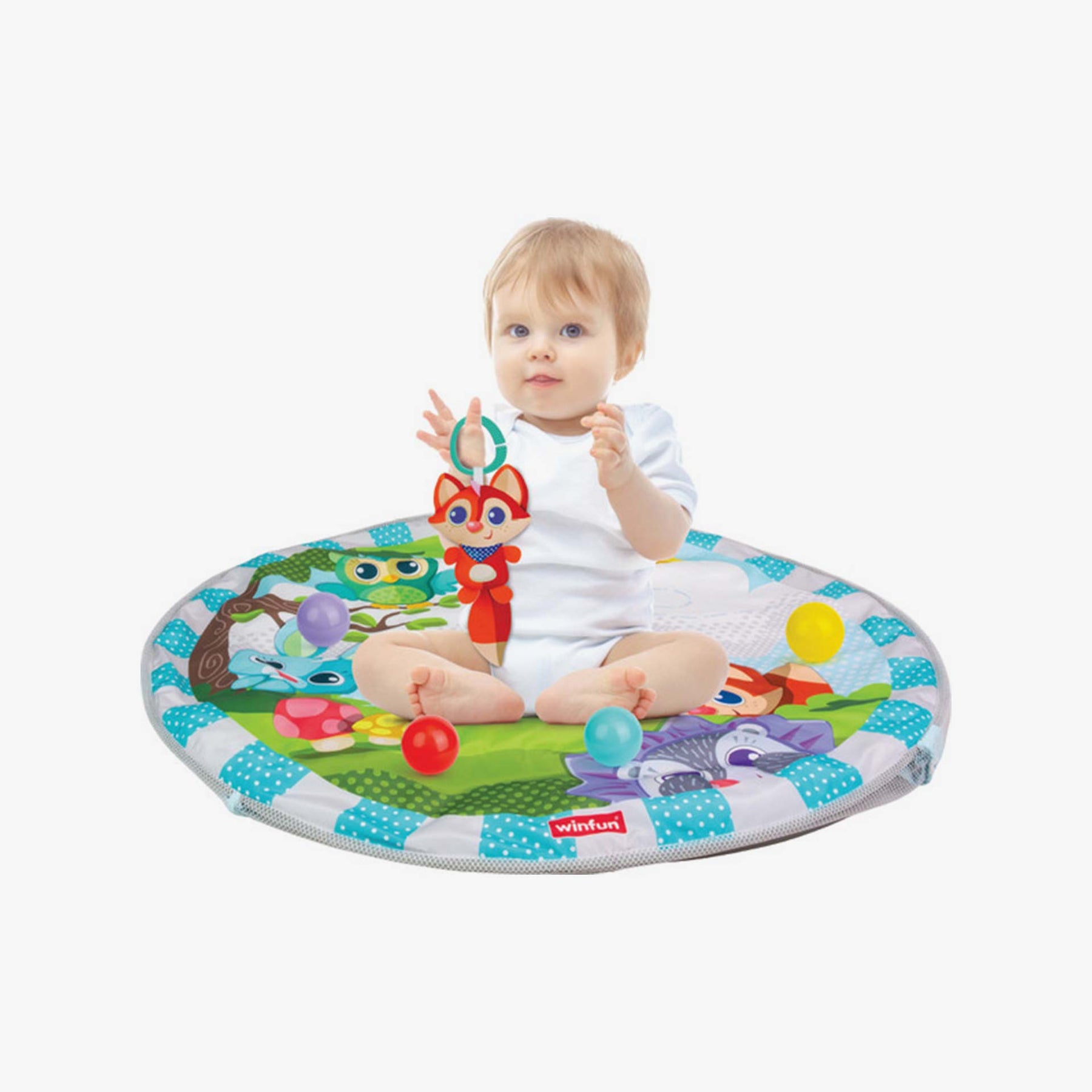 אוניברסיטה חיות וכדורים של ווין 4.פאן צעצועים נתלים - בובת שועל רכה בובת דביבון קשת מנגנת ומראת שמש בטיחותית.כולל 15 כדורי משחק צבעוניים.קוטר המשטח 79 סמ. מתאים מגיל 0 חודשים ומעלה. נדרשת סוללת AAA לא כלולה.