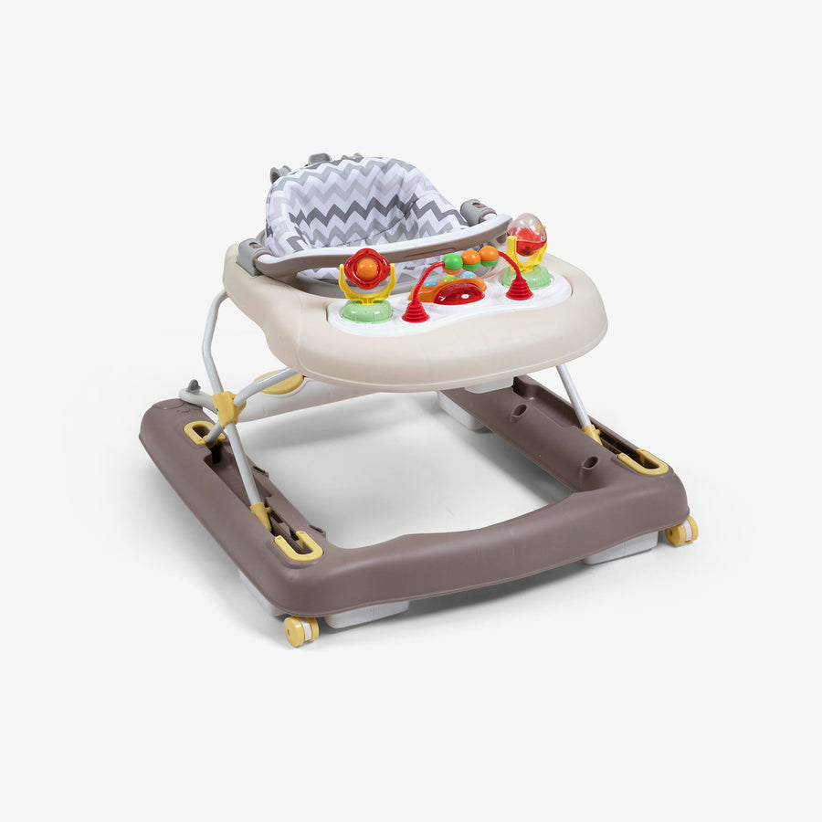 מצב 1 :הליכון ישיבה מגיל 6 חודשים. התינוק יושב במושב כשכפות רגליו על הרצפה. הוא דוחף את עצמו והולך וכך מסתובב לו ברחבי הבית. התינוק נהנה מהתנועה במרחב ומחקירת המרחב ומקבל בפעם הראשונה נקודת מבט חדשה על העולם שסביבו. ההליכה מחזקת את שרירי התינוק ותורמת לזקיפות גוו. הבר המוסיקלי מחובר לצד האחורי של ההליכון. מצב 2 :הליכון צעד ראשון מגיל 12 חודשים התינוק מתרגל צעדים ראשונים של הליכה עצמאית מחזק את שרירי הגוף ושיווי המשקל. אין חשש לנפילה התינוק יכול לעצור את ההליכון לעזוב אותו ולחזור אליו כרצונו. הבר המוסיקלי מחובר לצד הקדמי של ההליכון. מצב 3 :מרכז פעילות עם פעלולון לידיים ולרגליים מגיל 6 חודשים התינוק עומד על הרצפה דורך על הבר ומפעיל אותו. פעולה זו מגבירה את מודעותו לכפות הרגליים והוא נהנה מהמשוב התחושתי הבר המוזיקלי מחובר באמצע ההליכון. הקפידו לכוונן את ההליכון לגובה שיאפשר לתינוק להניח את כפות רגליו על הרצפה בשלמותן. מומלץ להגביל את השימוש בהליכון כדי לאפשר לתינוק תנועה חופשית מרבית תרגול זחילה עמידה והליכה עצמאית.( דרושות 5 סוללות AA לא כלול(