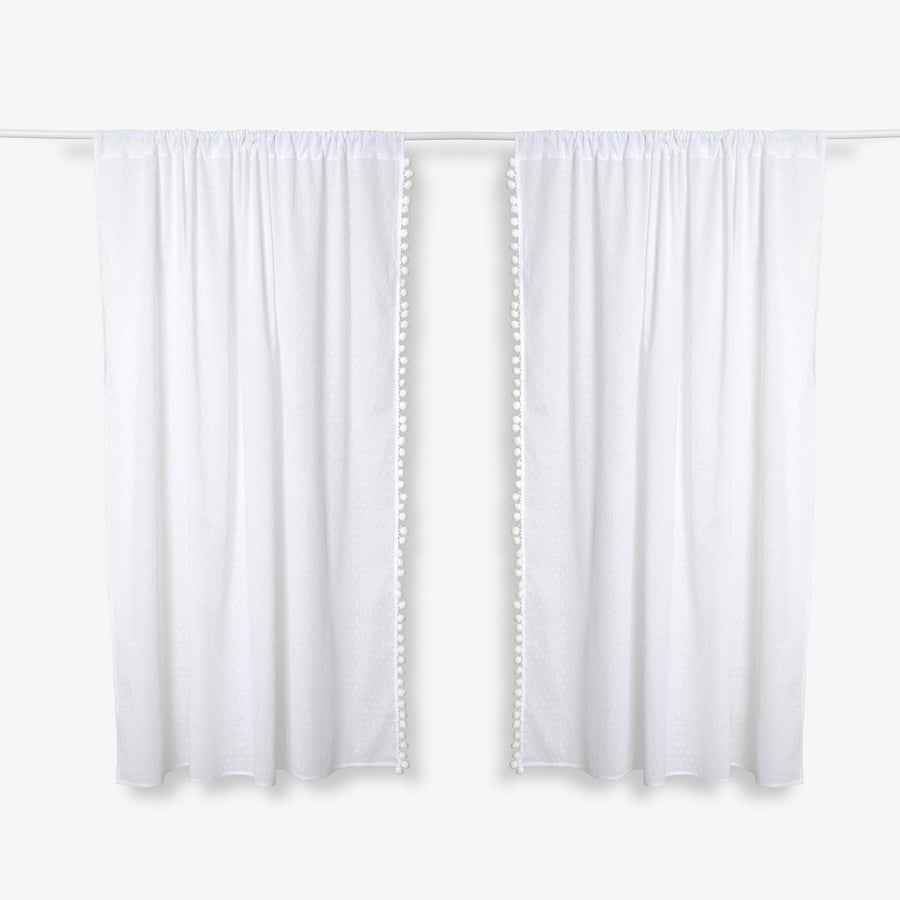 זוג ווילונות עם פונפונים בצבע לבן לחדר ילדים. 100% כותנה בדוגמת נקודות מידה 135X160 סמ.