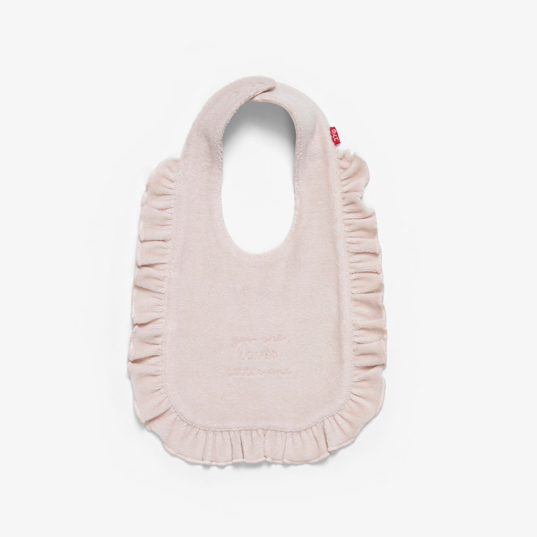 זוג סינרים קטיפתיים בצבעים פודרה ושמנת. לסינרים מסגרת מלמלה דקורטיבית וסגירת לחצן תיק-תק.