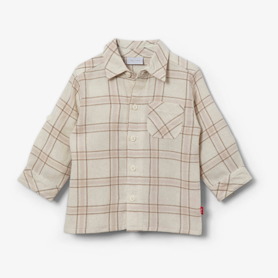 חולצת פלאנל מכופתרת בצבע אבן ובהדפס משובץ. לחולצה מפתח צווארון קלאסי וכיס.