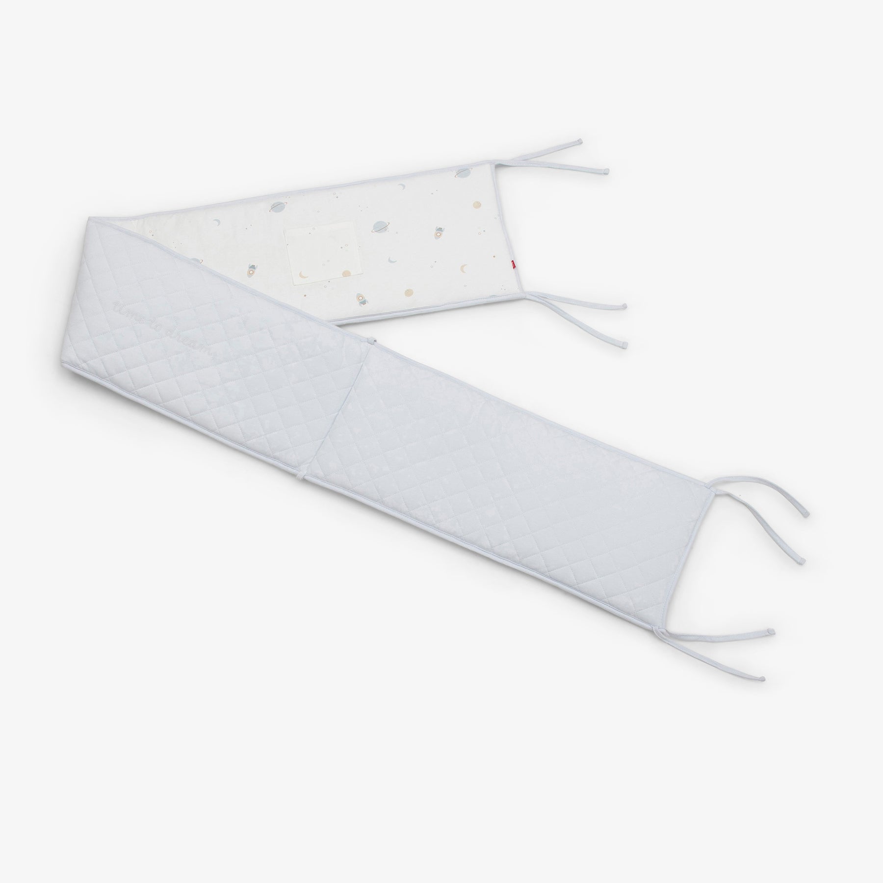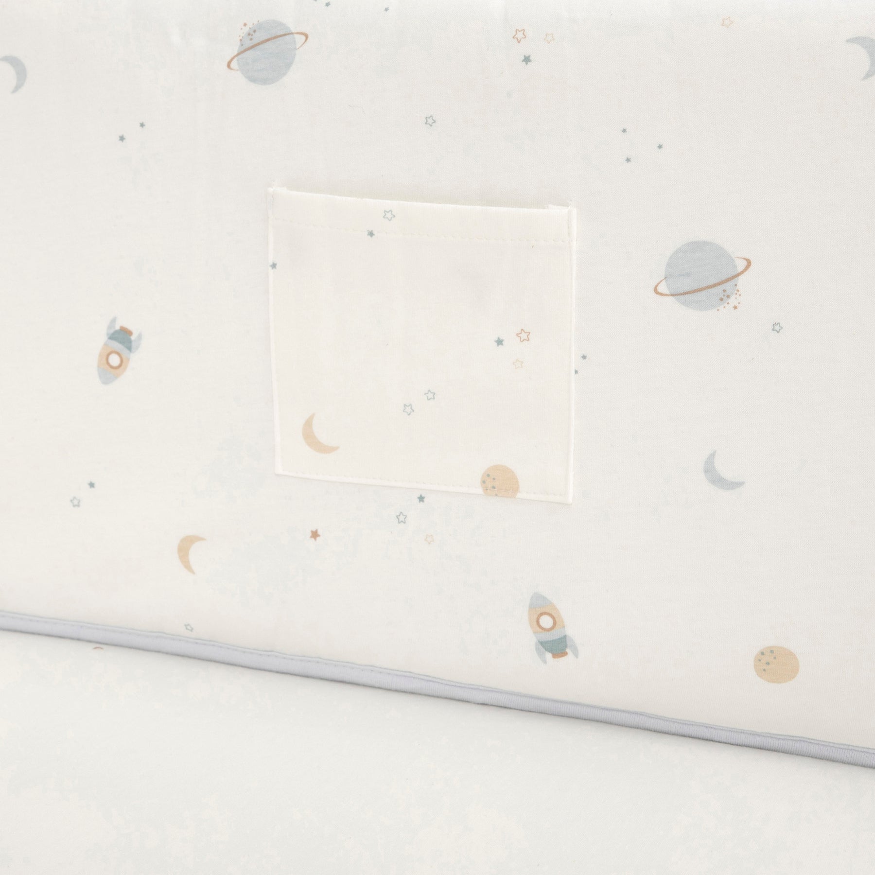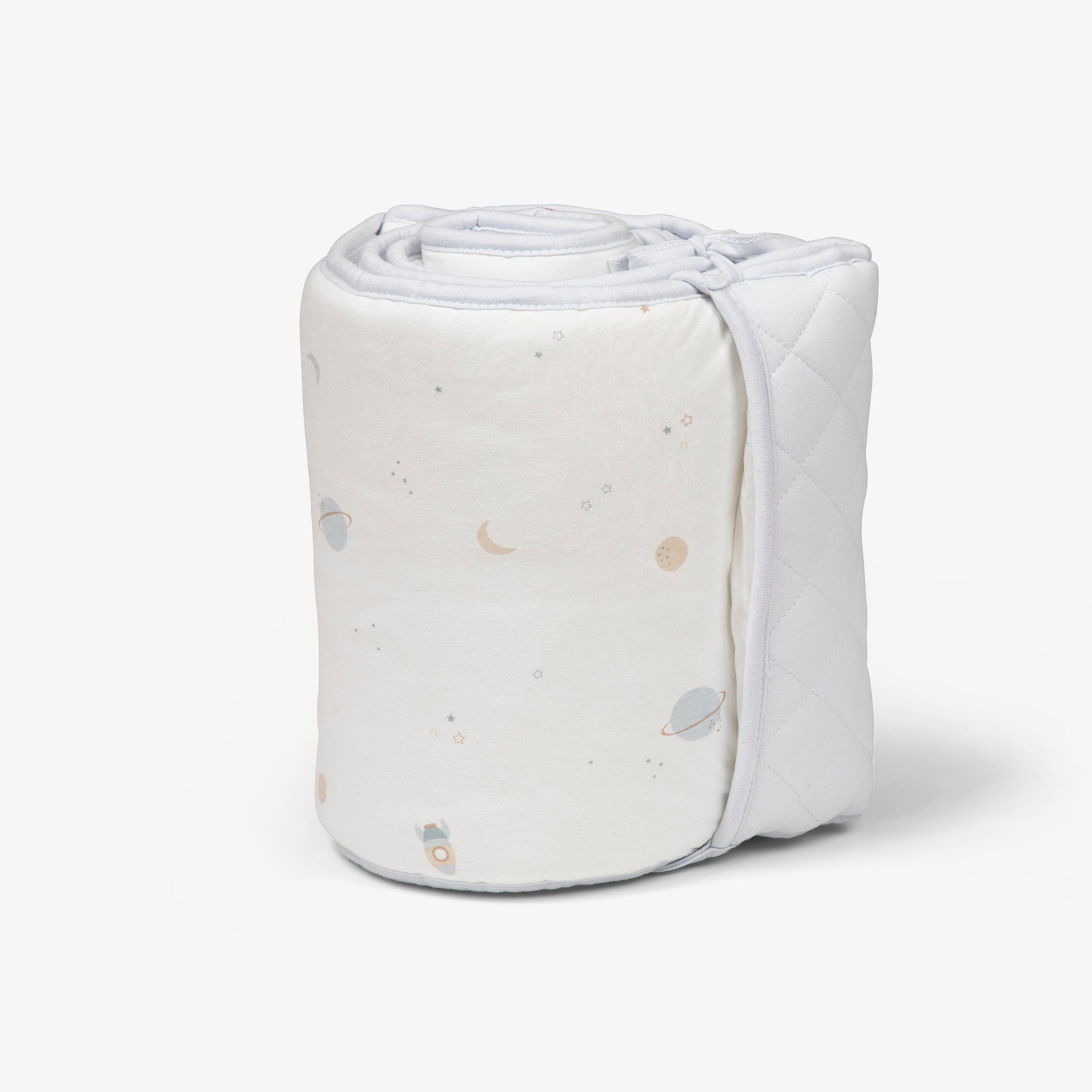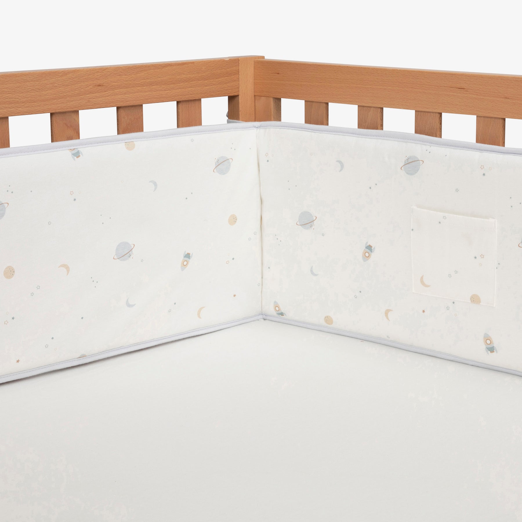 מגן ראש מעוצב למיטת התינוק עם כיס קטן לאחסון מוצץ. המגן בהדפס של חלליות מתוך קולקציית mix it החדשה. 100% כותנה+ מילוי 100% הוליפייבר. 28X191 סמ.