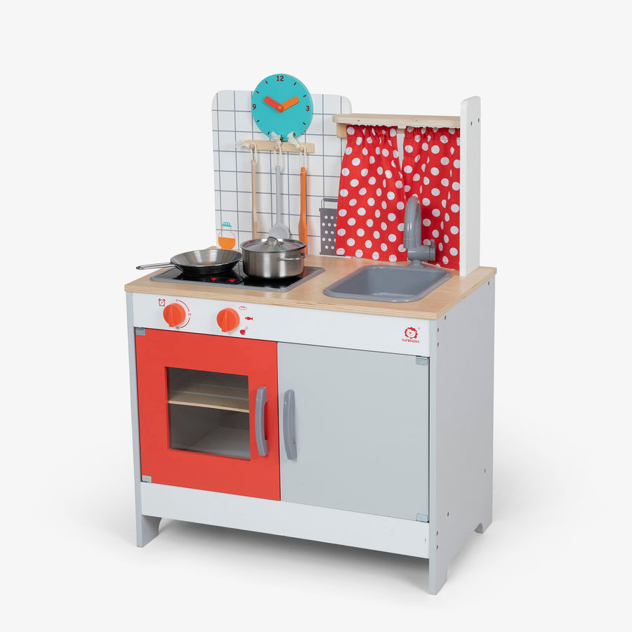 מטבח עץ גדול רחב ויציב עם כיריים מאירות וכפתורי הצתה תנור וארון אחסון עם דלתות שנסגרות עם מגנט. כיור וברז וילון שעון עם מחוגים מסתובבים וכלים: סיר ומחבת מתכת וכף בישול תרווד ותרווד מחורץ.