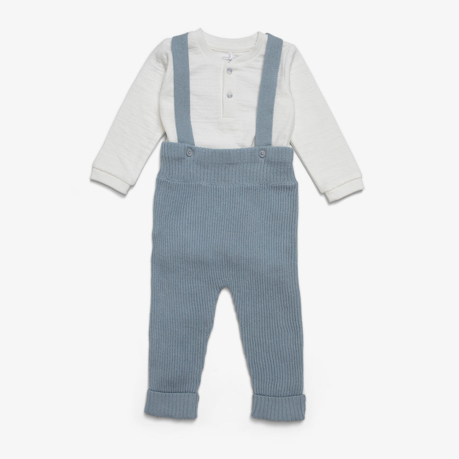 מכנסי אריג בטקסטורת ריב עם רצועות שלייקס בצבע כחול שמיים ובגד גוף ארוך.