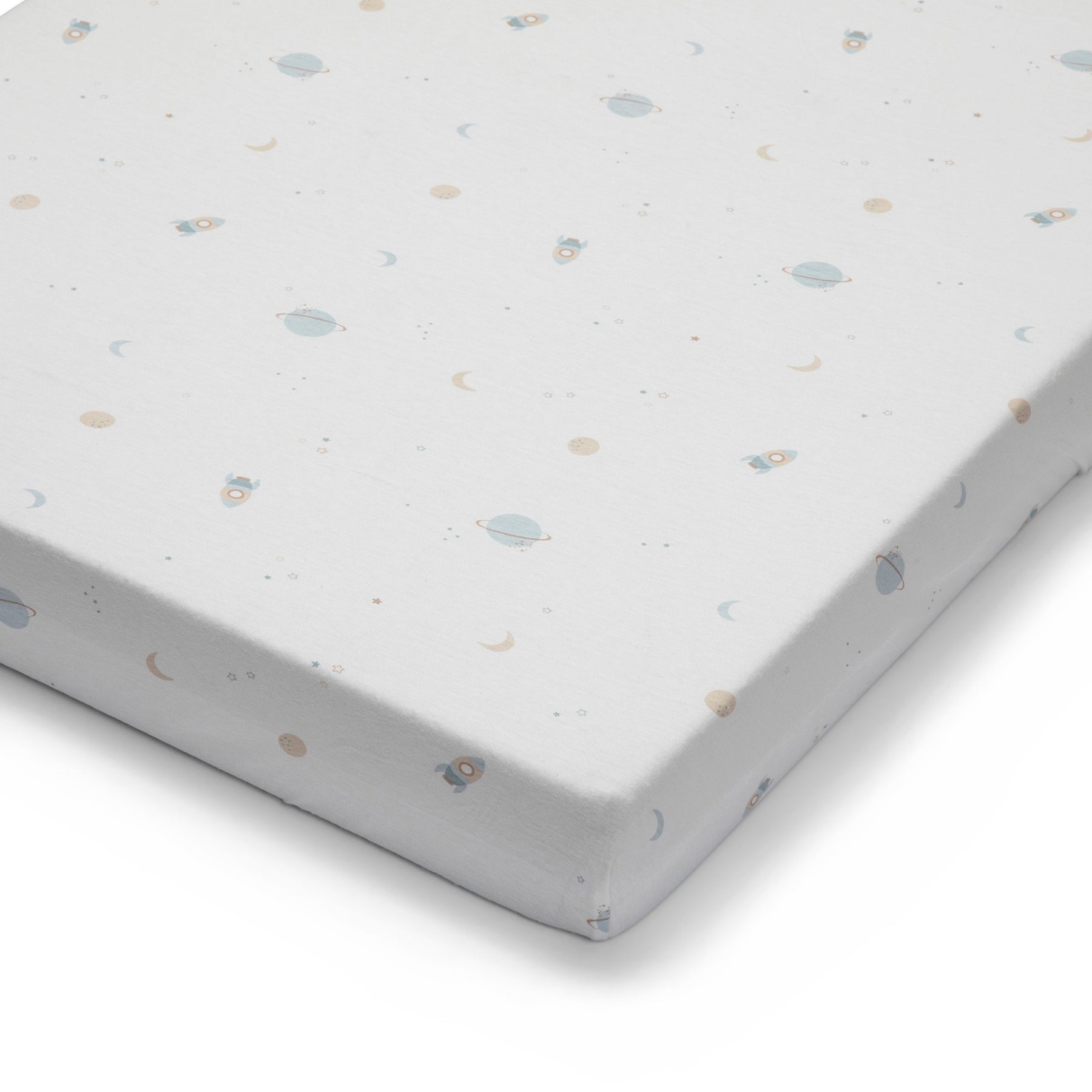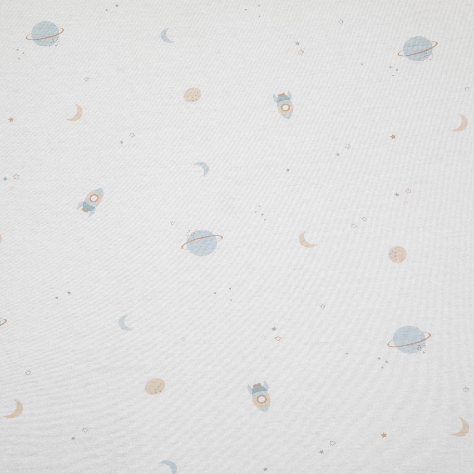 סדין כותנה איכותי למיטת תינוק. הסדין בצבע קרם בהדפס חלל החיצון. 100% כותנה. 70X130 סמ.