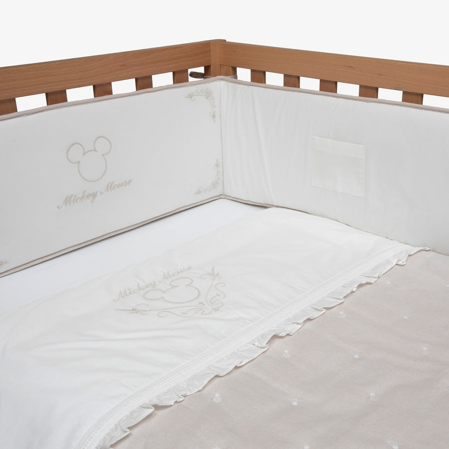 סט מצעים למיטת תינוק/ת בעיצוב לוגו מיקי מאוס. הסט בצבע בז' וכולל מגן ראש 28/192 סמ 100% כותנה+מילוי 100% פוליאסטר שמיכה 115/85סמ 100% כותנה+ מילוי 100% פוליאסטר סדין 65/128 סמ 100% כותנה.