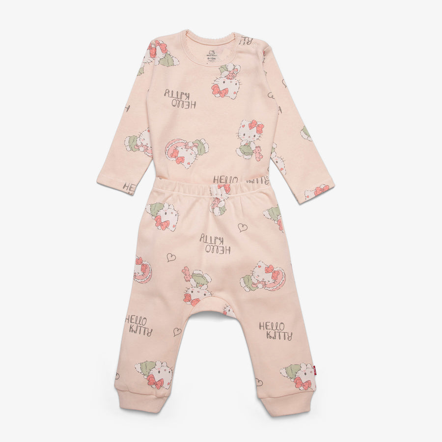 פיג'מה סט 2 חלקים בגד גוף ומכנסיים ארוכים בצבע אפרסק ובהדפס הלו קיטי.