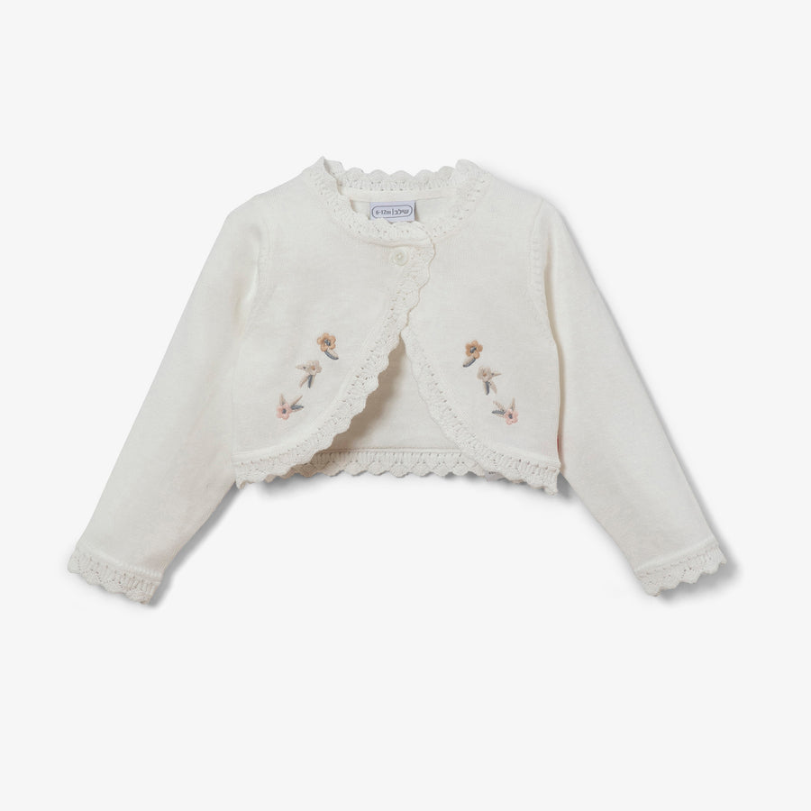 קרדיגן בולרו סרוג בצבע אוף וויט עם מסגרת תחרה דקורטיבית ורקמות פרחים.