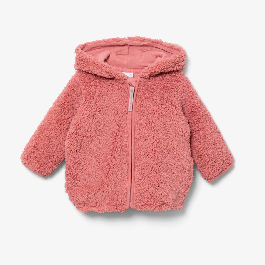 קרדיגן קפוצ'ון מפרוות שרפא בצבע ורוד מסמיק. לקרדיגן סגירת רוכסן.