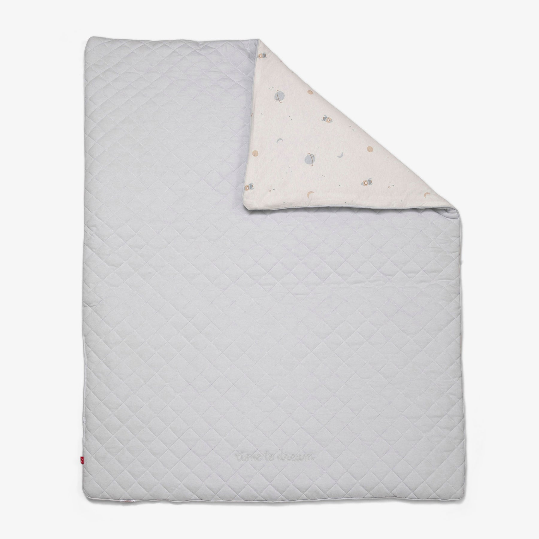 שמיכה מרופדת עם מילוי למיטת תינוק/ת. השמיכה בצבע כחול בייבי ובעיצוב חלליות. מידה 85X115 סמ. הרכב בד כיסוי 100% כותנה+ מילוי 100 הוליפייבר.