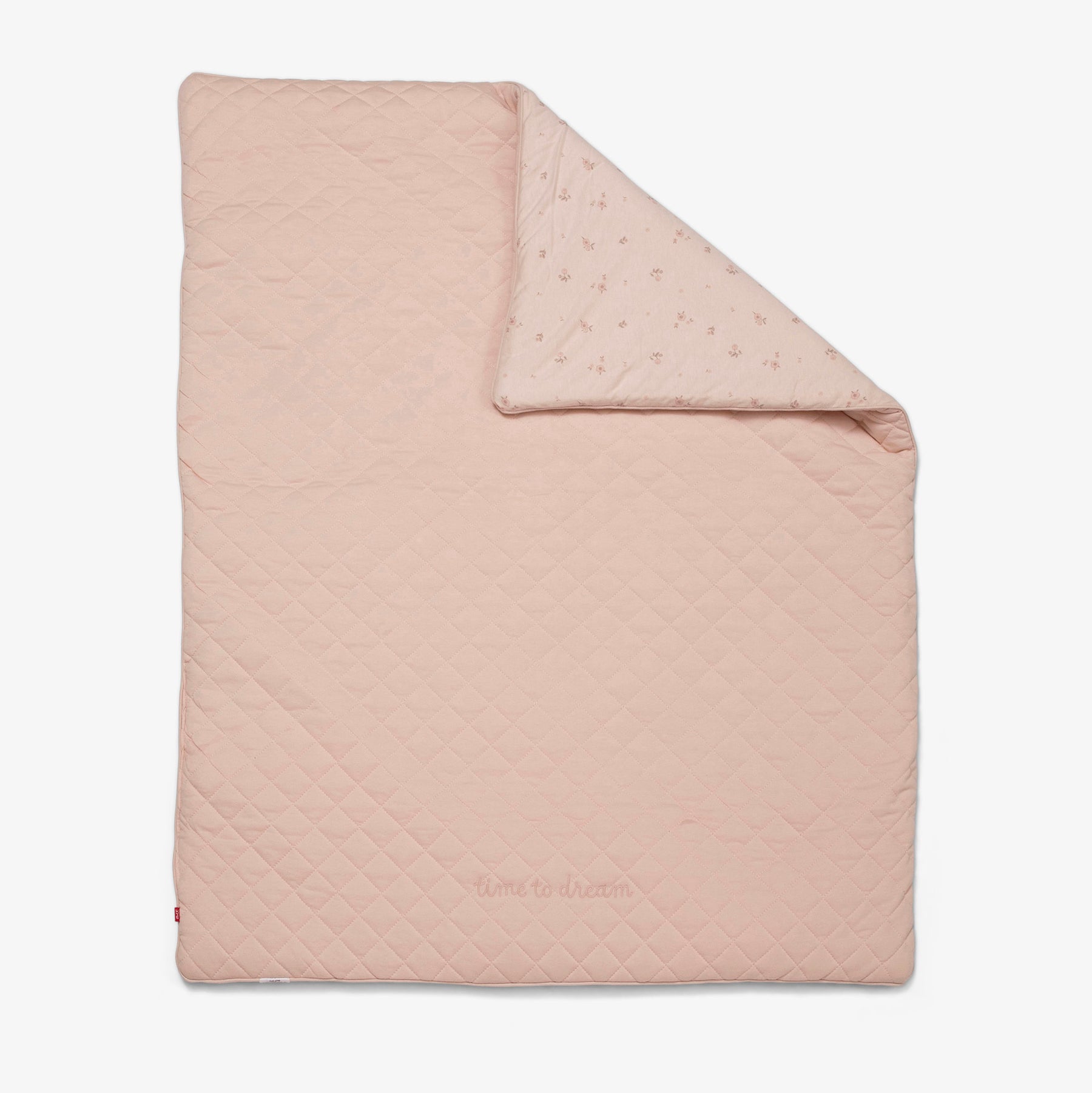 שמיכה מרופדת עם מילוי למיטת תינוק/ת. השמיכה בצבע ורוד ובעיצוב פרחים. מידה 85X115 סמ. הרכב בד כיסוי 100% כותנה+ מילוי 100 הוליפייבר.