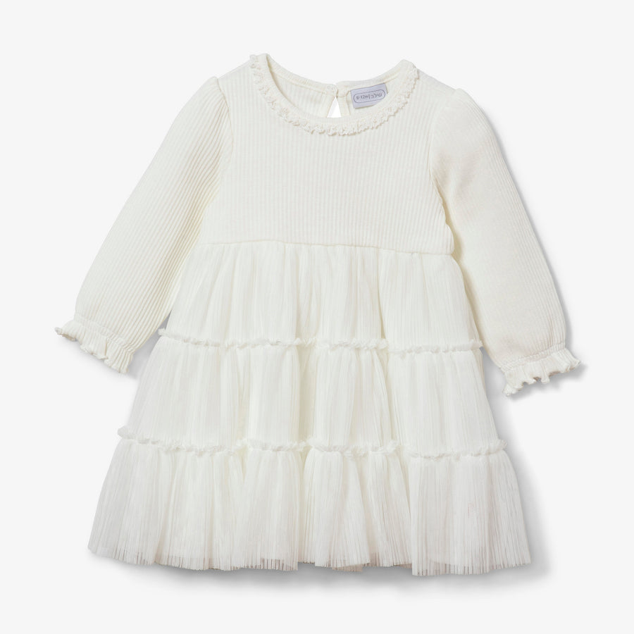 שמלת קרפ עם קומות בצבע אוף וויט.לשמלה שרוולים ארוכים ובטנה.