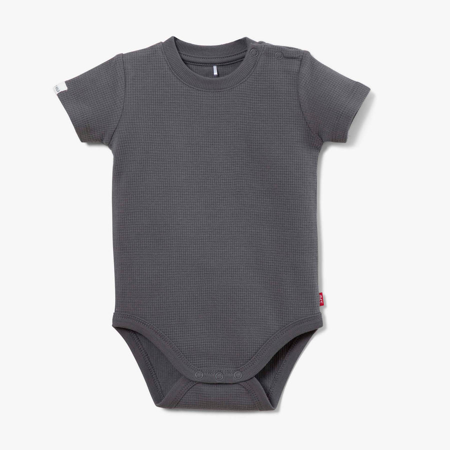 בגד גוף איריס קצר בצבע אפור חם. לבגד טקסטורת בד וופל ופאץ' עם כיתוב אנגלית בקצה השרוול.