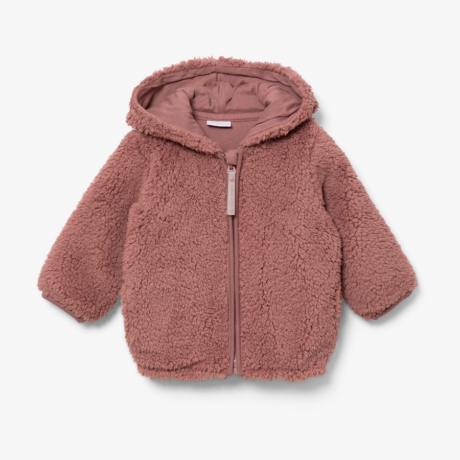 קרדיגן קפוצ'ון מפרוות שרפא בצבע סגול מעושן. לקרדיגן סגירת רוכסן.